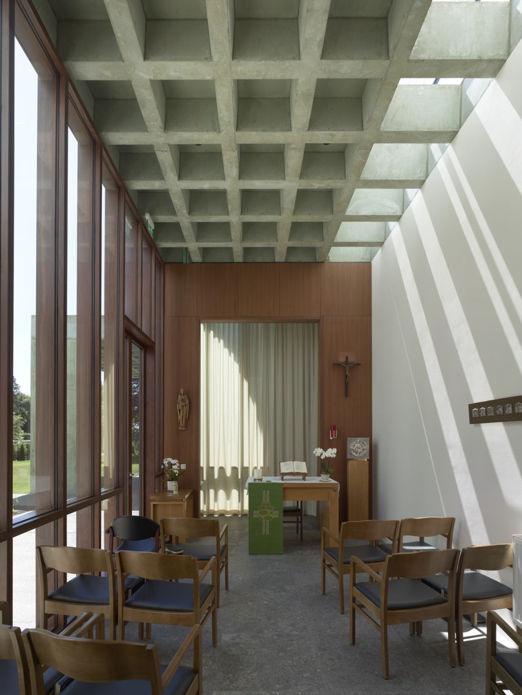 De extra functies bevinden zich onder één prominente luifel. Deze voorziet met een genereuze ruimtelijkheid buiten- en binnenkamers voor een nieuwe kapel, een tuinkamer en dienstruimtes. De cassettestructuur laat toe om met een beperkt aantal dragende vinnen tot ver in de kloostertuin te reiken.