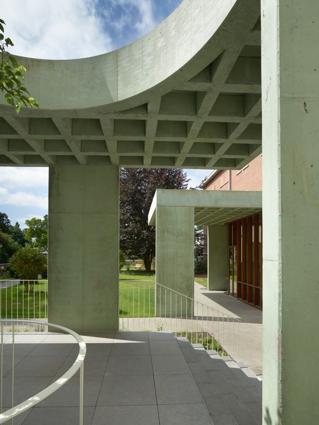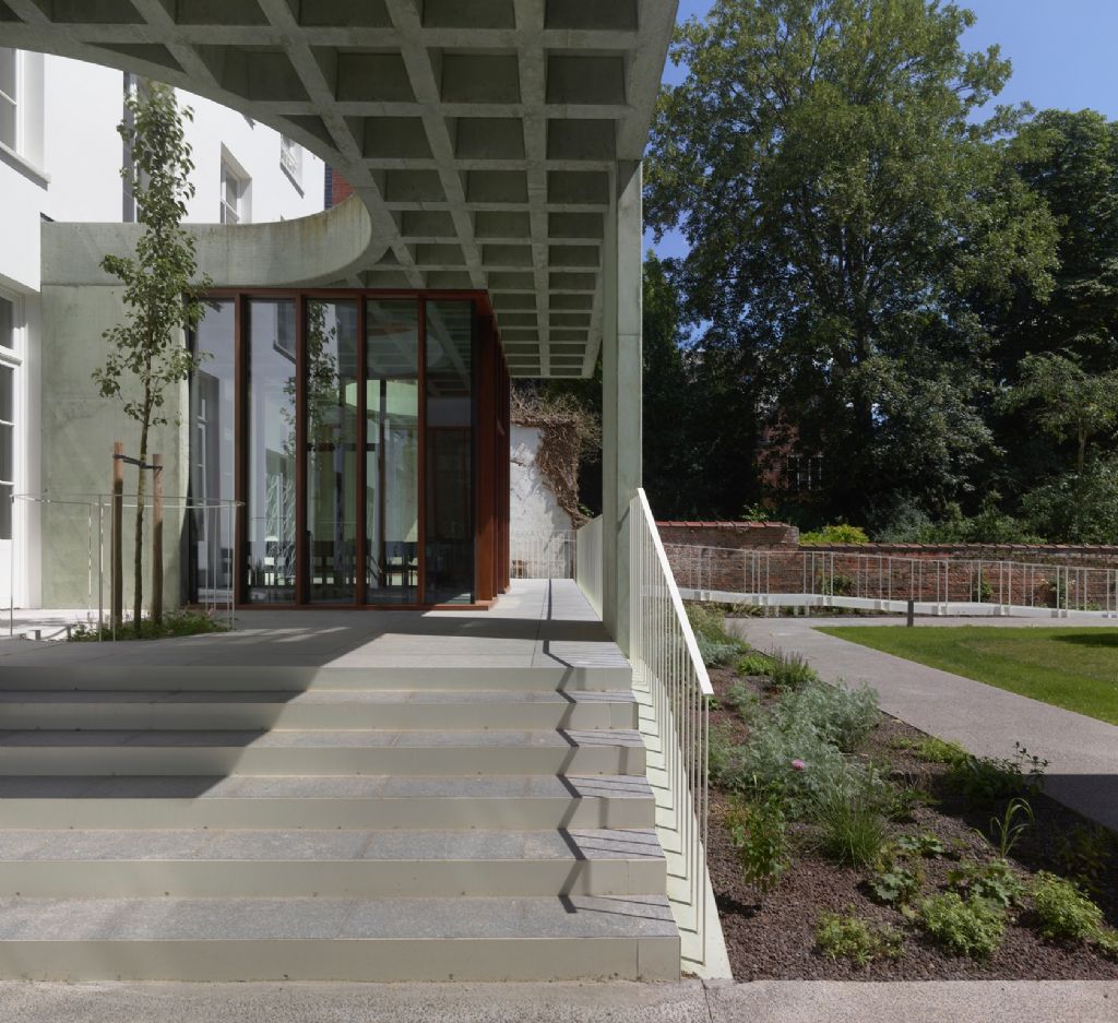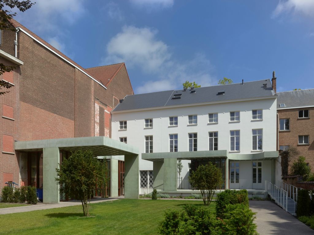 Aan de hand van een speciale dakstructuur in groen gepigmenteerd beton werd een lichtvoetige toevoeging gedaan die een spel speelt tussen open- en geslotenheid. Het massieve dak meandert tussen het gebouw en de tuin om zo beschutting te geven aan de nieuwe functies alsook licht en lucht in het historisch huis toe te laten.