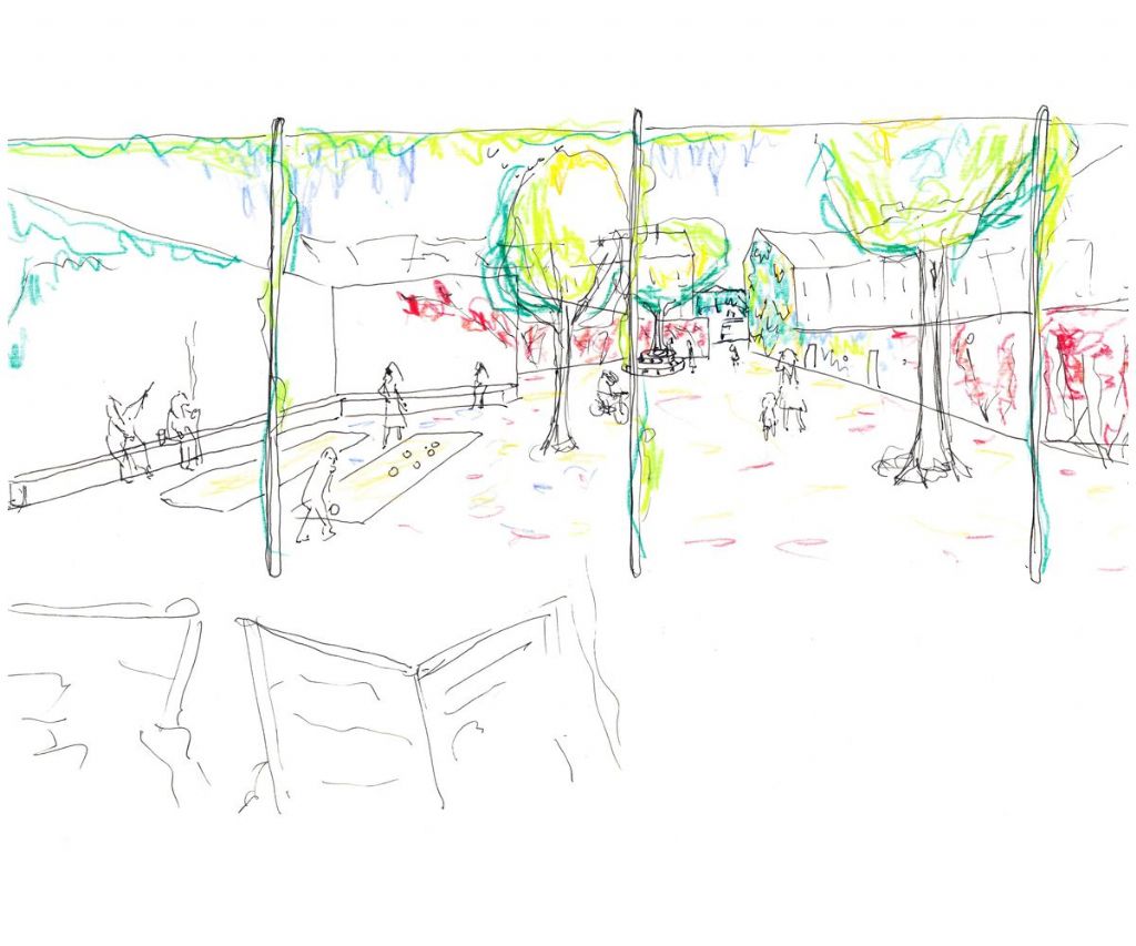 Via beide toegangen kunnen buurtbewoners wandelen naar de zonnige binnentuin tussen de loods en de luifel. Daar ontmoeten ze elkaar in een groene oase. Zitplekken worden afgewisseld met plantenbedden. Door ‘eigen kweek’ te vermengen met bloeiende en geurende planten, wordt het een ‘lusttuin’ voor mens, flora en fauna. Ook allerhande spelprikkels vinden een plek in het park: moestuinen, schommels, podium, waterspeelplek en pluktuinen.