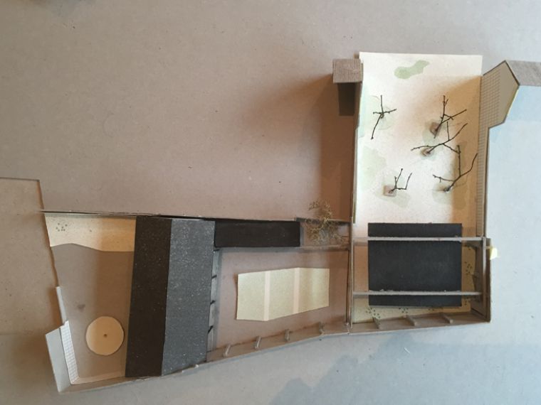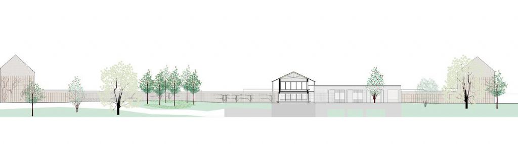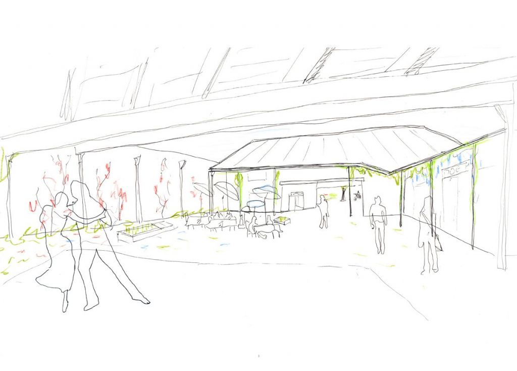 Het ontwerpvoorstel behoudt in het centrum van de site de ‘mooiste’ loods met fijne vakwerkspanten en herstelt deze in ere. Het wordt een groot slank gebouw dat dwars op de as van het hele terrein staat. Deze loods moet het kloppend hart van de site vormen waar heel wat buurtactiviteiten zullen doorgaan.