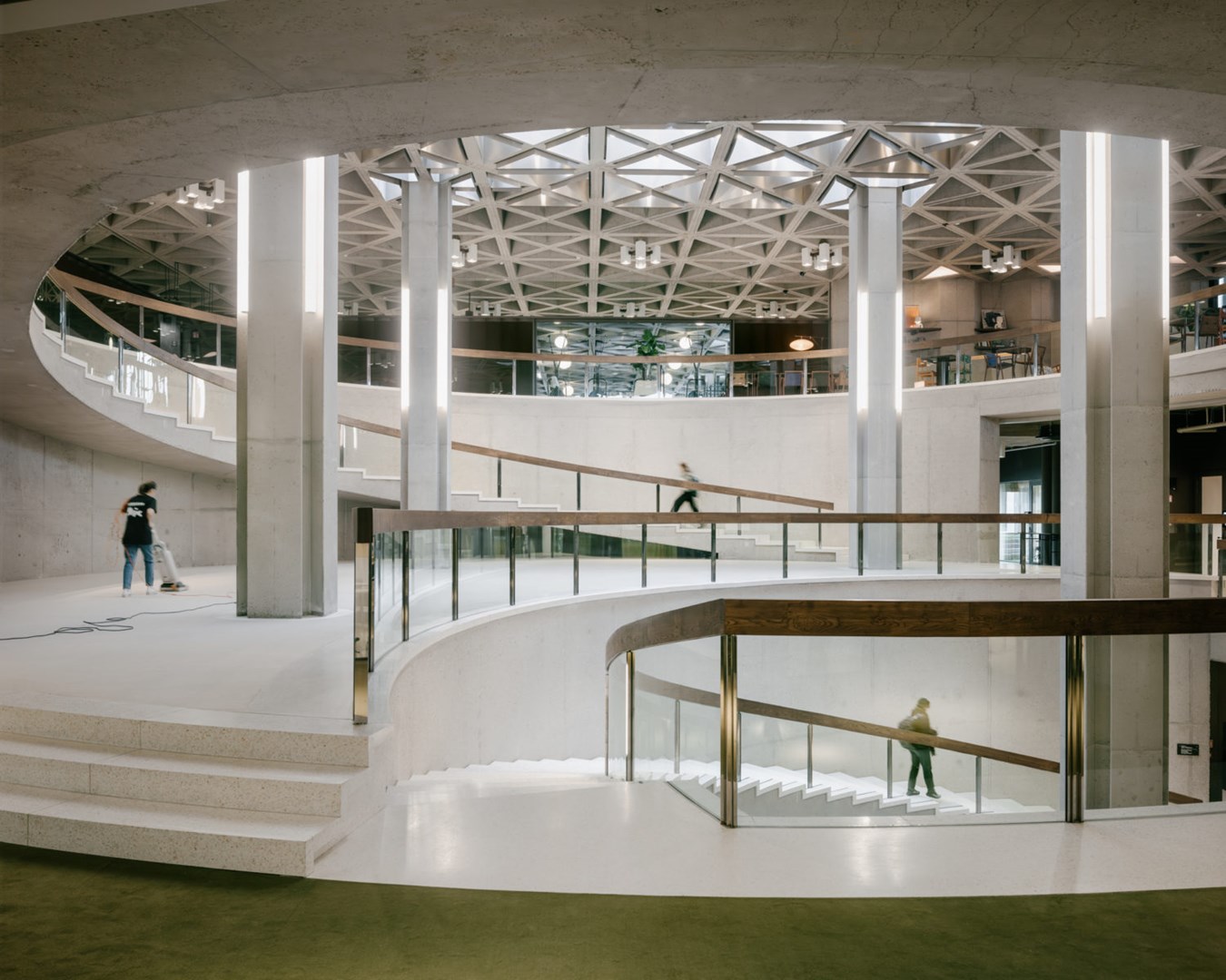 De ruimteakoestiek in het atrium bracht extra uitdagingen met zich mee. De invulling van de betoncassettes in het plafond werd herwerkt, aangevuld met akoestische wandafwerkingen. Zo ontstond een beheersbare geluidsomgeving, ondanks de openheid en visuele impact van deze ruimte. De grenzen tussen de levendige foodmarket en stillere aanpalende zones werden zorgvuldig bewaakt, met het oog op rust en concentratie.