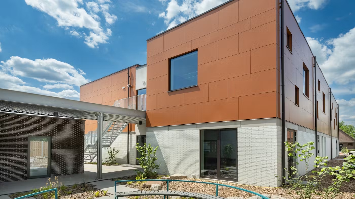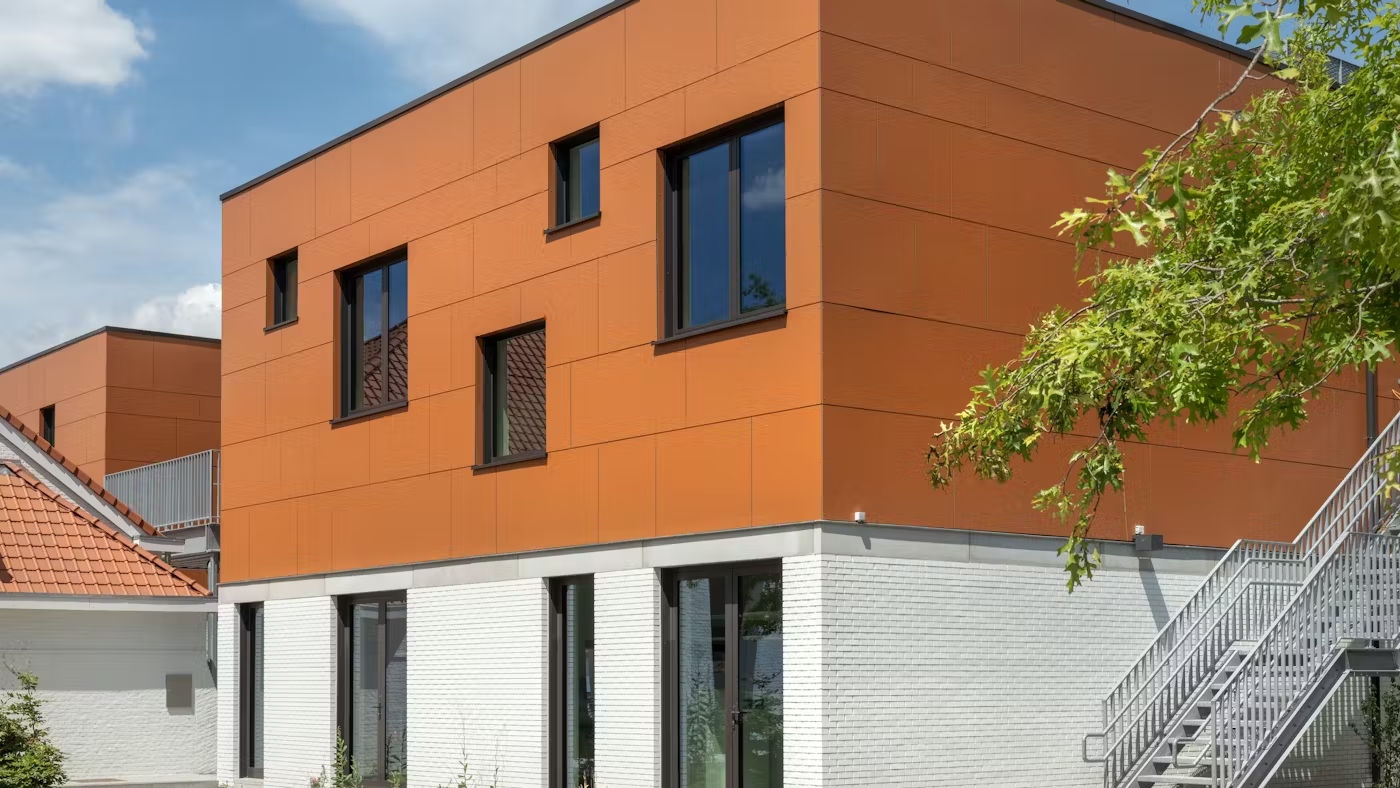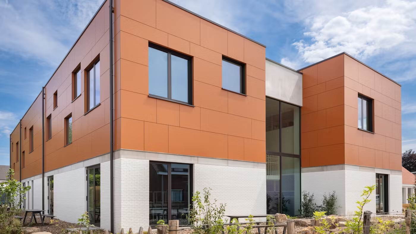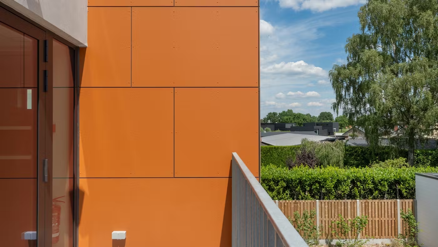 Bij de nieuwbouw speelden esthetiek, duurzaamheid en brandveiligheid een cruciale rol. “De nieuwbouw moest aansluiten bij de stijl van de gerenoveerde gebouwen,” vertelt Geudens. “We gebruikten wit geschilderd metselwerk voor de benedenverdieping in combinatie met oranje gevelpanelen van Rockpanel in de kleur RAL 8023, die perfect matchen met de originele oranje dakpannen. Het Rockpanel Colours gamma bood ons niet alleen een uitgebreide kleurkeuze, maar ook een kostenefficiënte oplossing die paste binnen het budget.”