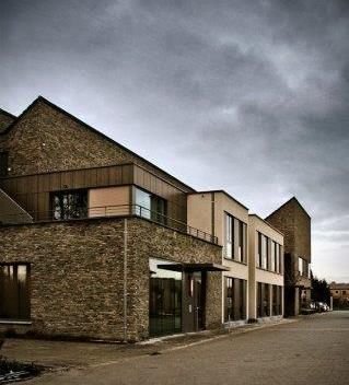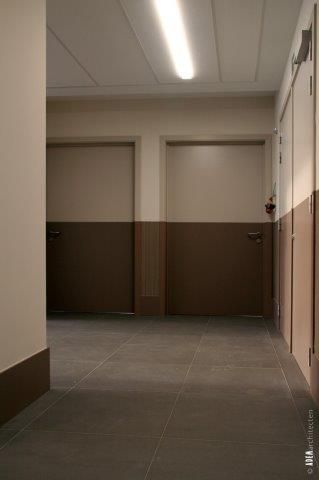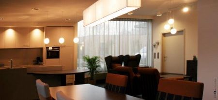 Abrahams vond in architect Maarten Van Eyck (ADEMarchitecten) en interieurarchitect Jo Langendries (Langendries & Nivelle) de geknipte personen om zijn ideeën vorm te geven. Samen realiseerden ze drie aangename, functioneel ingerichte woningen die elk plaats bieden aan zeven (jong)dementerenden. “We kregen de opdracht om de typologie van een huis – met gezellige living, open keuken en kamers met voldoende privacy – zo veel mogelijk te benaderen,” vertellen Maarten Van Eyck en Jo Langendries. “De drie woningen lopen wel in elkaar over, maar hebben toch een geheel eigen identiteit. Zo zijn de deuren tussen de verschillende woningen gemaskeerd doordat de muurbekleding doorloopt over de deuren, zijn woon- en slaapkamers uitgerust met stijlvol bijpassend meubilair en heeft elke woning een eigen inkomportaal met duidelijk geaccentueerde voordeur en gelaagdheid in de gevel (gevarieerde gevelafwerking met enerzijds baksteen en anderzijds pleister met tussenliggende verticale Trespa-beplating). Voorts was de materiaal- en kleurkeuze uiteraard heel belangrijk om die gewenste huiselijke sfeer op te roepen. We hebben alles vooraf goed uitgekiend om niets aan het toeval over te laten. Elke leefgroep heeft zijn eigen (subtiele) tint, die bijvoorbeeld terugkomt in het meubilair, de gordijnen en de grote foto's die we in de woningen hebben opgehangen. Dit geeft de leefruimtes een fris karakter en maakt bovendien dat de bewoners hun omgeving steeds herkennen. Daarnaast hebben we gekozen voor hoogwaardige, complementaire materialen (mooie armaturen, kwalitatief meubilair, strak afgewerkte keuken, enz.). De technieken zijn weggewerkt in de plafonds en een onopvallende technische verdieping onder de nok van het dak.”