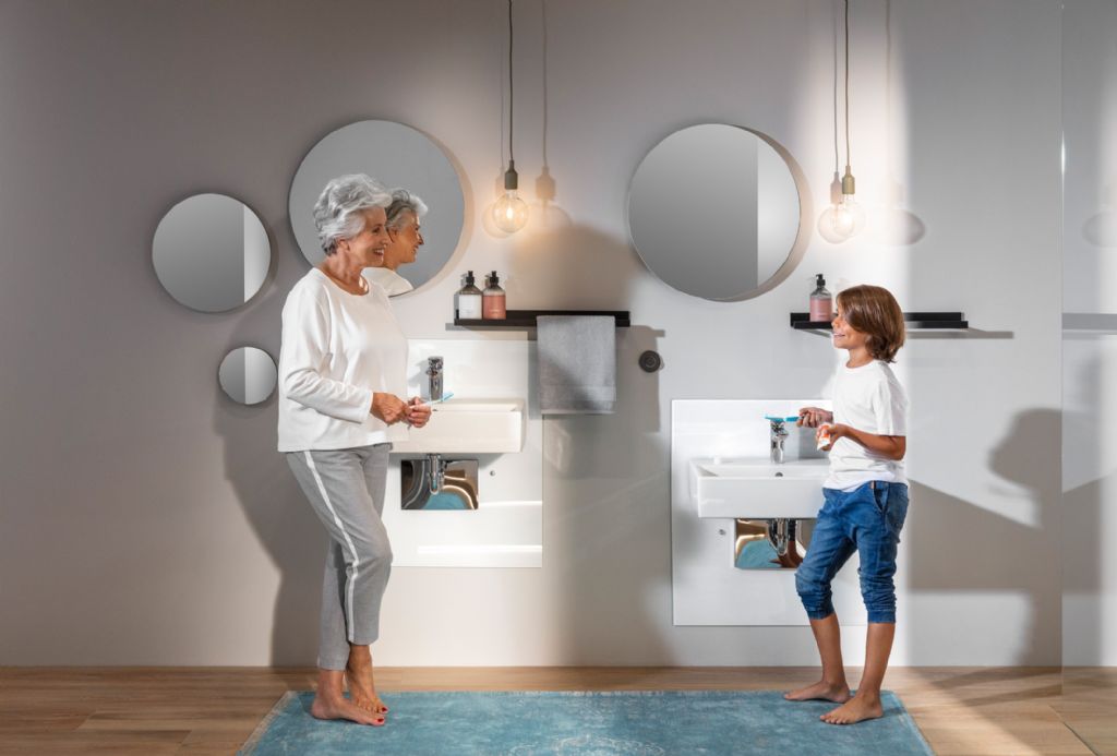 Grote troef is dat je zelf creatief de ruimte kan indelen met voorwandelementen voor toilet, wastafel, urinoir en bidet. De toilet- en wastafelelementen zijn zelfs in de hoogte verstelbaar, voor comfort op élke leeftijd. Het hele systeem is een innovatieve samenhang van bedieningsplaten, spoelreservoirs en montagerails, dat samen met installateurs werd ontwikkeld en geoptimaliseerd de afgelopen drie jaar. Dat maakt ook dat je kan kiezen uit meer dan 50 verschillende bedienings- en urinoirplaten, die door hun tijdloze design naadloos in elke badkamerinrichting passen.