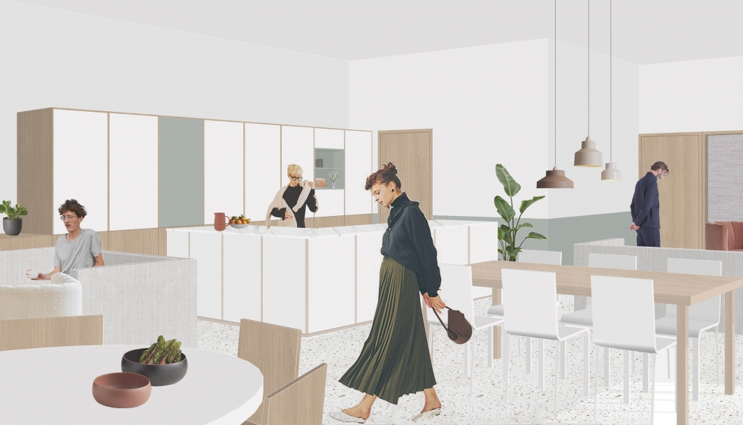 Binnenin vertaalt diezelfde logica zich in een zorgvuldige organisatie van de leefgroepen. De centrale leefruimte met open keuken vormt het hart van elke eenheid. Daaromheen worden de kamers in kleine clusters gegroepeerd, waardoor lange, anonieme gangen worden vermeden. In plaats daarvan ontstaan korte circulaties met zicht op groen en overvloedig daglicht.