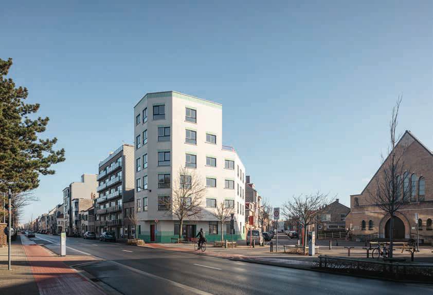 Door zijn ligging als toegangspoort tot de tuinwijk ‘Westerkwartier’ in Oostende speelt dit hoekgebouw met negen appartementen een strategische rol. Het voelt vertrouwd aan ten opzichte van de naburige tuinwijk, maar is ook duidelijk nieuw en anders.