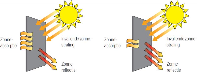 Donkerkleurige coatings die rechtstreeks blootgesteld zijn aan zonnestraling nemen meer warmte op dan lichtkleurige. Dit impliceert dat ze onderworpen zijn aan grotere temperatuurschommelingen en bijgevolg ook aan grotere thermische vervormingen. Zo kan het temperatuurverschil tussen een wit en een donker oppervlak met een gelijkaardige blootstelling oplopen tot 20 à 30 °C.