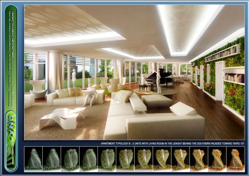 Taipei, Taiwan krijgt een bijzonder groen gebouw. De wolkenkrabber toont zich uniek in de stad met zijn natuurlijke uitstraling. Een rondomlopende rij van bomen vormt zich naar het menselijke DNA. Vincent Callebout Architectures won in 2010 de ontwerpwedstrijd. De honderd meter hoge toren biedt ruime flats voor de welgestelden onder ons.