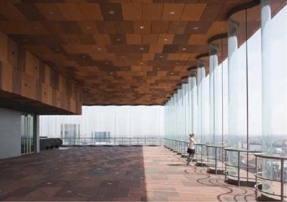 De torenconstructie rust op een centrale betonnen kern van 13 x 13 meter (169 m²). Hieraan zijn grote metalen frames bevestigd die het vloeroppervlak uitbreiden naar 38,7 x 38,7 meter (ca. 1500 m²). De tien opeengestapelde verdiepingen springen in ten opzichte van elkaar en vormen zo aaneengeschakelde kubussen die grote oversteken creëren.