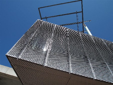 'Hier hebben wij strekmetaal met een variabele maas toegepast. Deze variabele maas is zo geconstrueerd dat wij kijken naar het zonnepad. In juni heb je hoge zon, in december lage. Wij maakten een zodanige hoogte van de maas zodat er een maximale lichtdoorlaat is en een minimale zondoorlaat. Hierdoor hebben de mensen binnen het gebouw geen last van de warmte en krijgen ze toch zoveel mogelijk licht.