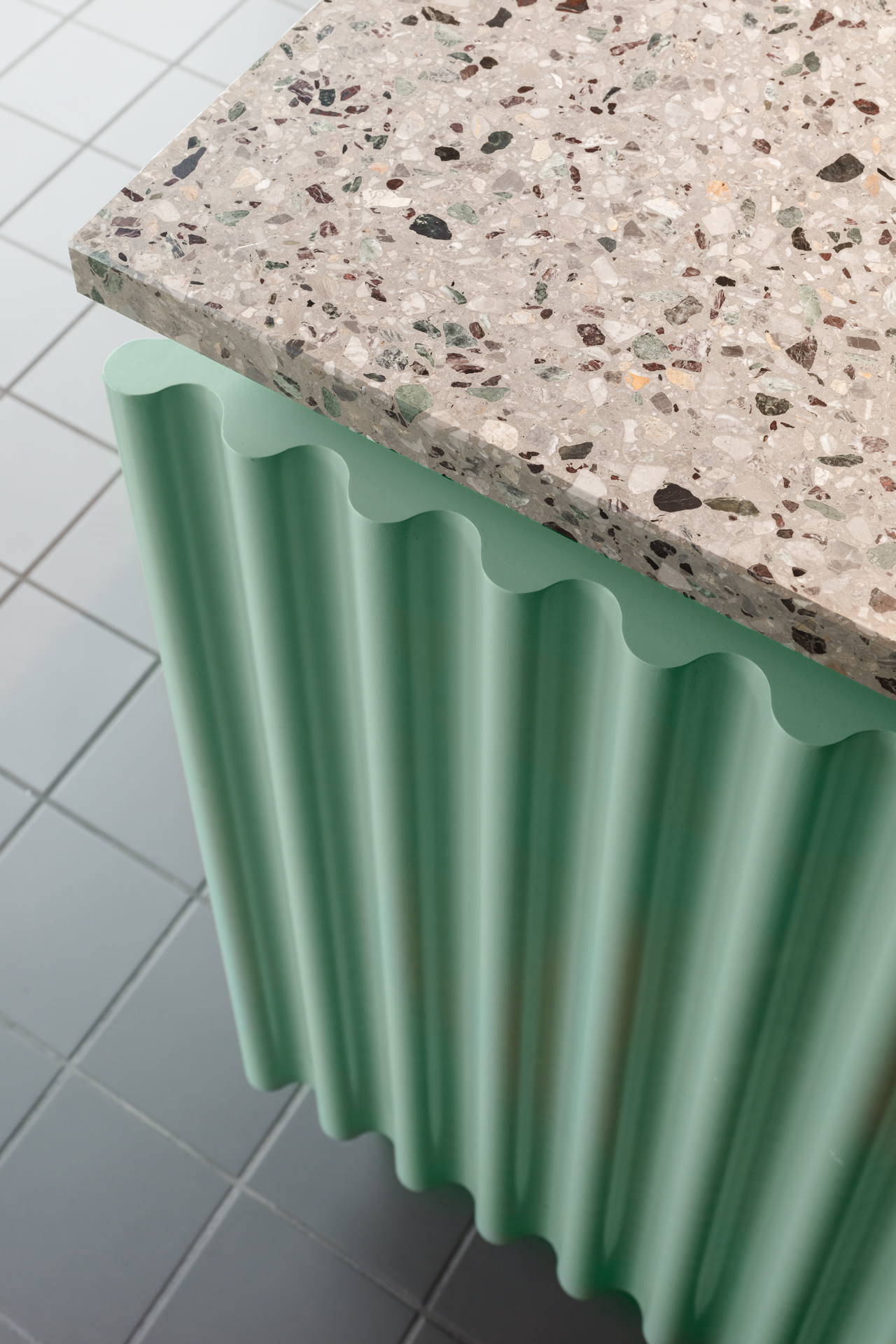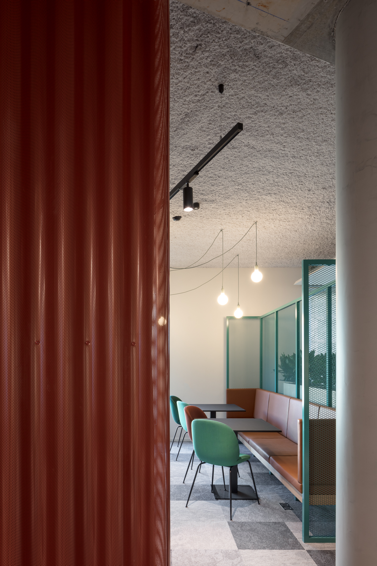 Bakstenen, terrazzo & golfplaten: deze traditionele, haast alledaagse materialen komen in vrijwel elke oude Belgische woning voor. PUUR zocht innovatieve manieren om deze materialen te integreren in het Googlekantoor. Zo markeert een terrazzo vloer de hoofdcirculatie op de verschillende verdiepingen en zijn ook de werkbladen in de koffiezones in het materiaal uitgevoerd. Golfplaten werden dan weer als tussenwanden of draagstructuren gebruikt en bakstenen werden verwerkt in de wand achter de onthaalbalie (zie volgende pagina).