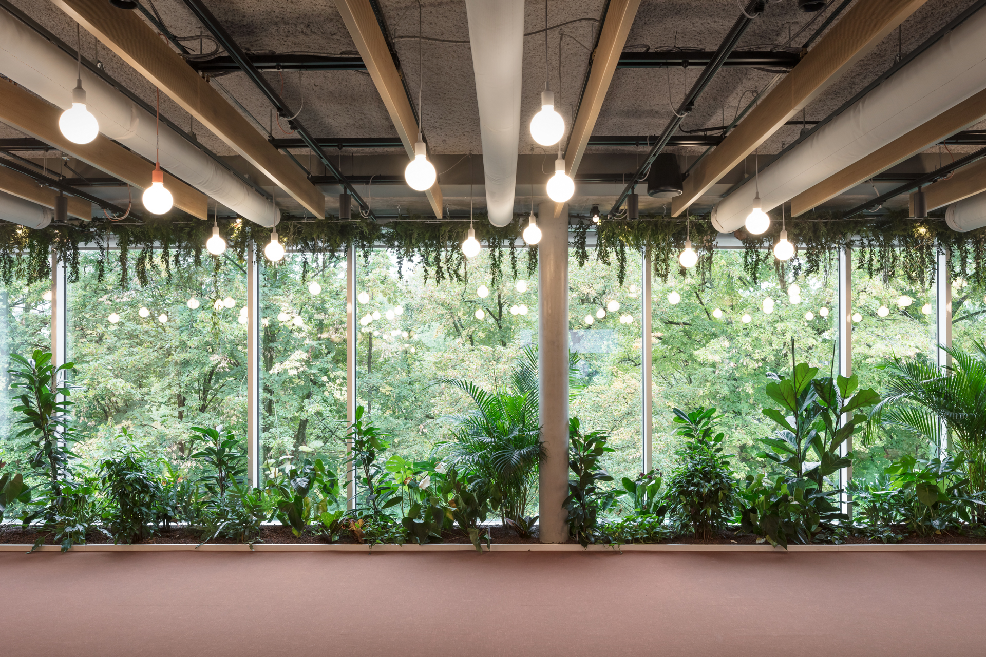 In de ruimtes die direct aan het park grenzen, waaronder het café en het restaurant, werd een houten vloer, die door het Brusselse Rotor werd aangeboden, een tweede leven gegeven. De vloer, afkomstig uit een magazijn waar heftrucs rondreden, werd plankje voor plankje gedemonteerd, in het Googlekantoor gelegd, geschuurd en behandeld.