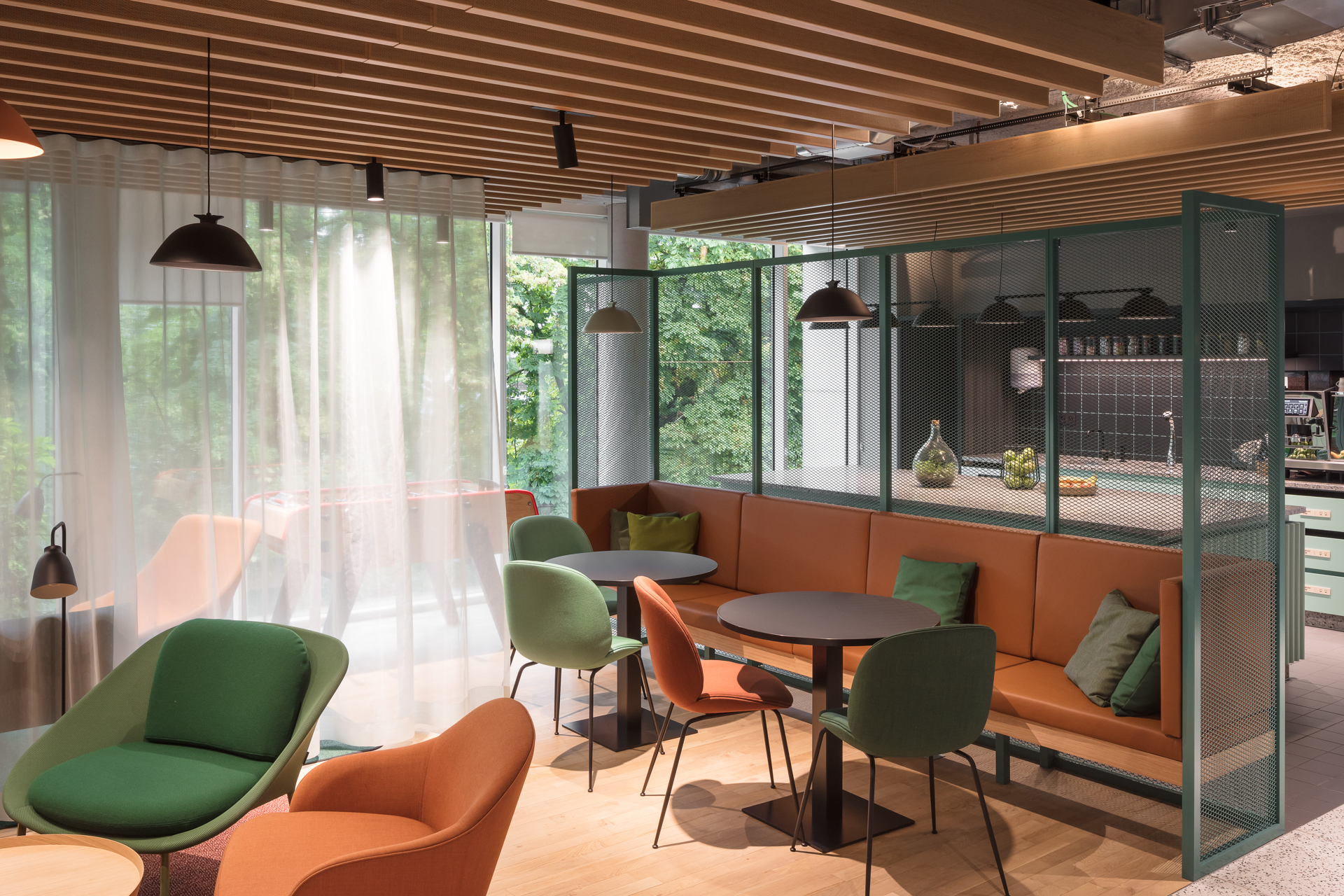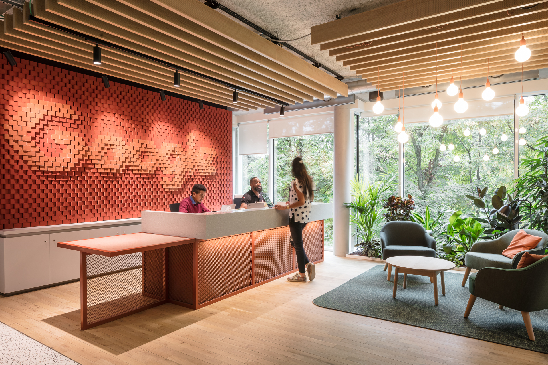 PUUR opteerde voor het kantoor in Brussel voor een erg leefbaar en duurzaam interieur met een lokale, Belgische identiteit. Zo werd er gekozen voor traditionele bouwmaterialen die iedere Belg kent, zoals bakstenen, terrazzo en golfplaten, maar ook voor kathedraalglas dat nog in veel oude Belgische gebouwen voorkomt. Ook het park dat zich aan de voorzijde van het pand uitstrekt werd maximaal betrokken in het ontwerp, om het licht en het groen maximaal naar binnen te trekken. De oorspronkelijke ontvangstbalie blokkeerde het zicht op het park en nam veel licht weg. De nieuwe balie werd daarom een kwartslag gedraaid, wat het gevoel geeft steeds verbonden te zijn met het park. Een gevoel dat versterkt wordt door het groen dat aan de binnenzijde van de glazen gevel ‘kleeft’ en de grens tussen binnen en buiten vervaagt.