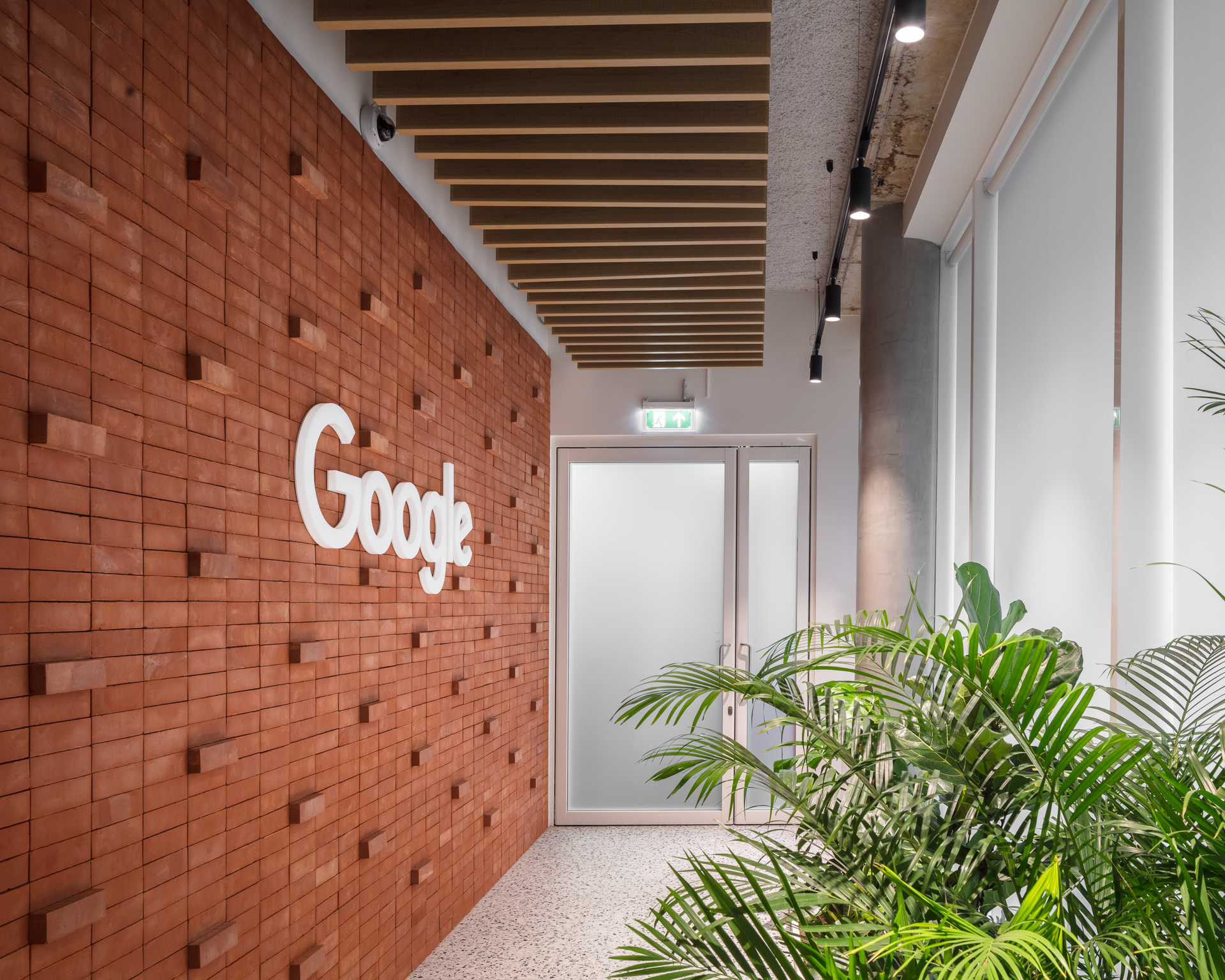 Bijzonder is ook het gebruik van kathedraalglas, dat nog in veel oude Belgische gebouwen voorkomt. De wanden van de vergaderruimtes werden in dit ‘troebele’ glas uitgevoerd, zodat een bepaalde mate van privacy ontstond. “Het is alsof je door water kijkt: je ziet wel dat er iemand voorbijloopt of aan het vergaderen is, maar niet wie het is”, aldus Jan Geysen van PUUR. “De wand achter de ontvangstbalie op de derde verdieping, laat goed zien waar Google voor staat. Roodkleurige baksteen, een alledaags materiaal, lieten we op basis van digitale data door een robot verlijmen tot Google-logo. Het resultaat is verbluffend en symboliseert de drive om continu te vernieuwen en te verbeteren die zo duidelijk in het DNA van Google zit.”