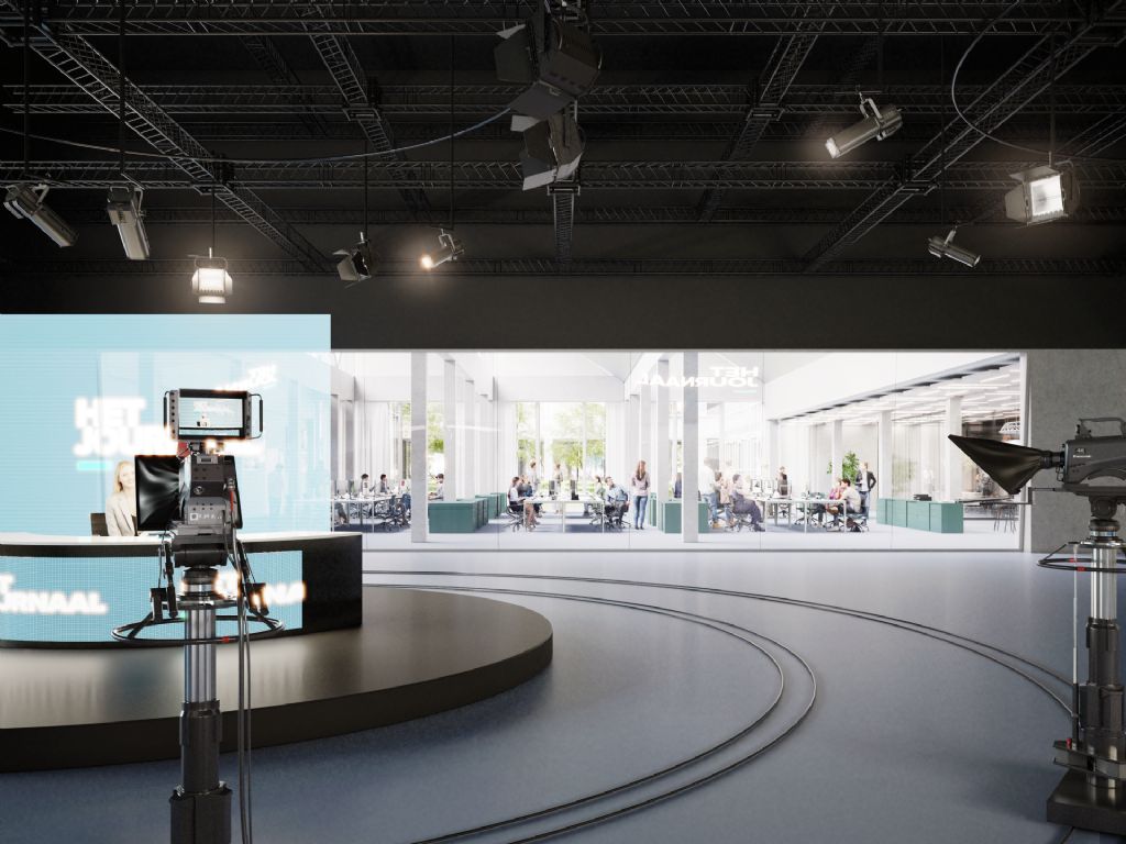Op niveau van de Verlainestraat liggen de 3 TV-studio’s met bijhorende logistieke ruimtes. Een tussenniveau maakt het mogelijk daglicht te voorzien voor de loges en crew-faciliteiten op korte loopafstand van de studio’s.