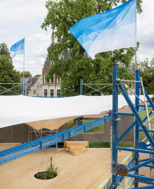Het Paviljoen zelf rust op schroefpalen die de experten met schroeven in de grond draaiden. Ze hoefden met andere woorden geen belastende fundering te storten, en beperken zo de impact op de omgeving tot een absoluut minimum. Na Stories Unfold zullen ze de schroeven netjes terug uit de bodem draaien, zonder dat er een spoor van achterblijft. Tot slot bestaan de wanden van het Paviljoen uit klassieke bekistingspanelen om beton tegen te storten. Deze gladde panelen dienen nu om de omgeving te kaderen en binnen te trekken in het Paviljoen.