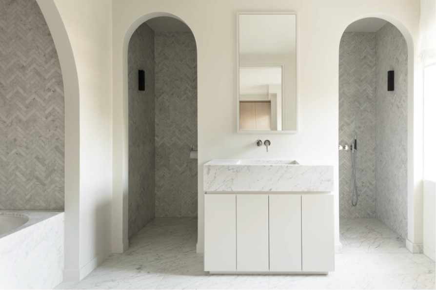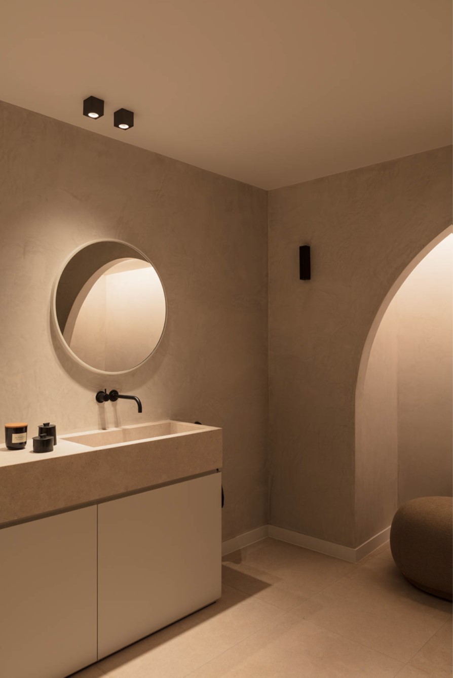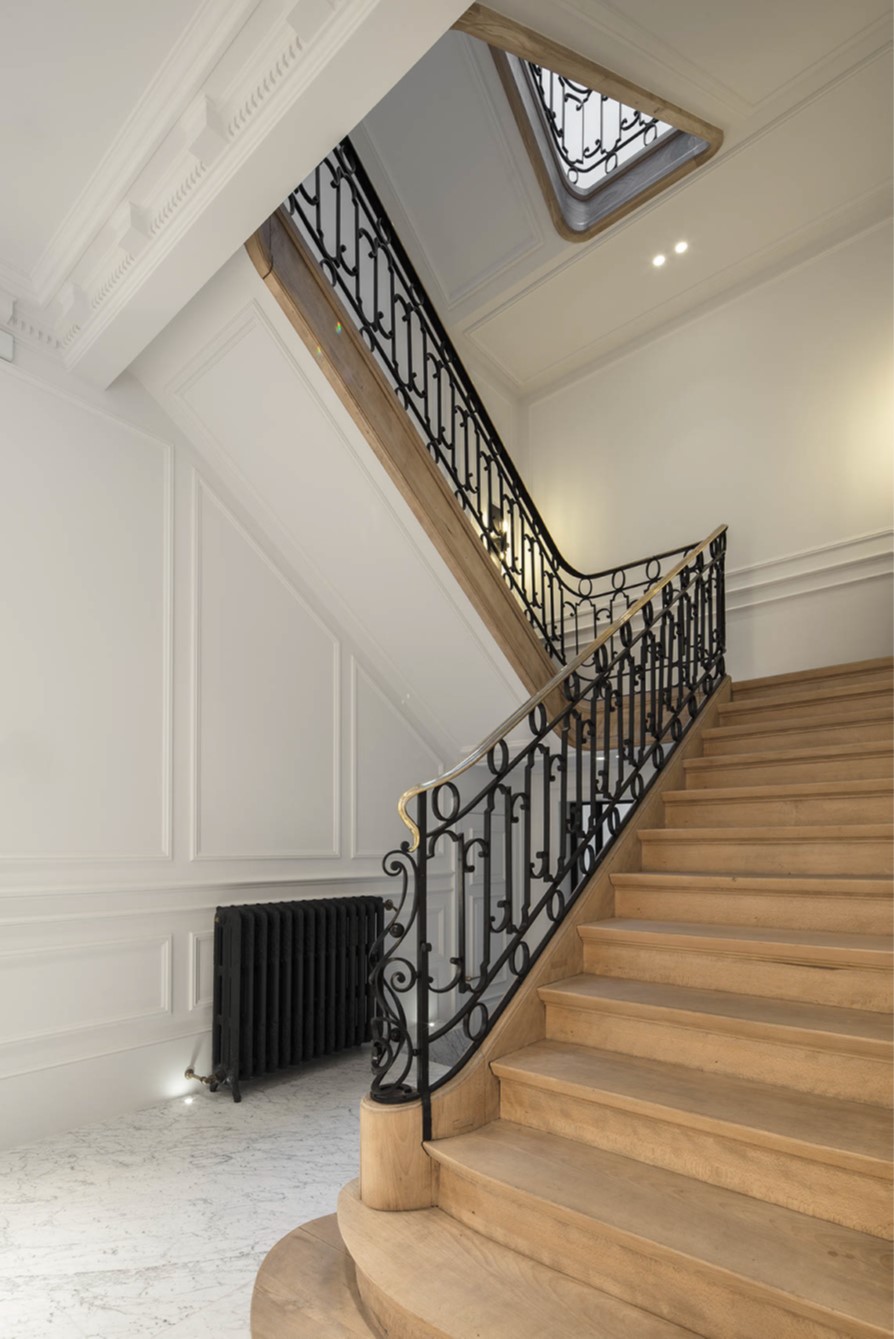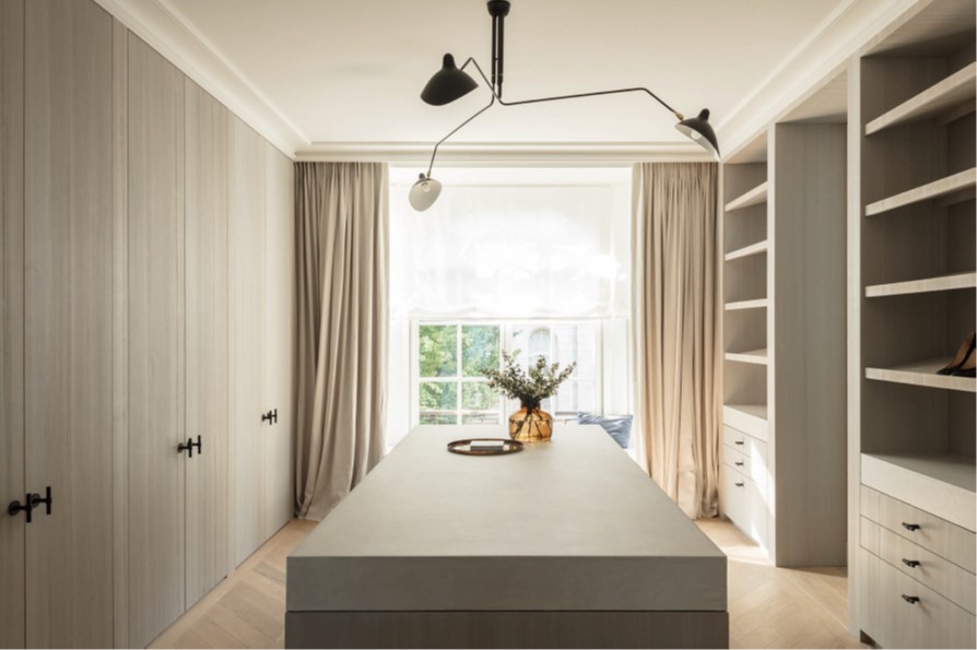 De gehele eerste verdieping is ingericht als master bedroom met kleedkamer, badkamer, bureau en extra ruimte voor een andere kamer en/of bureau. Op de tweede verdieping bevinden zich nog 4 andere kamers met bijbehorende badkamers. “De gevel is in originele staat hersteld, maar we hebben (onopvallend) de toegangspoort verbreed om de mogelijkheid te geven om met de auto binnen te rijden”, aldus JUMA Architects.