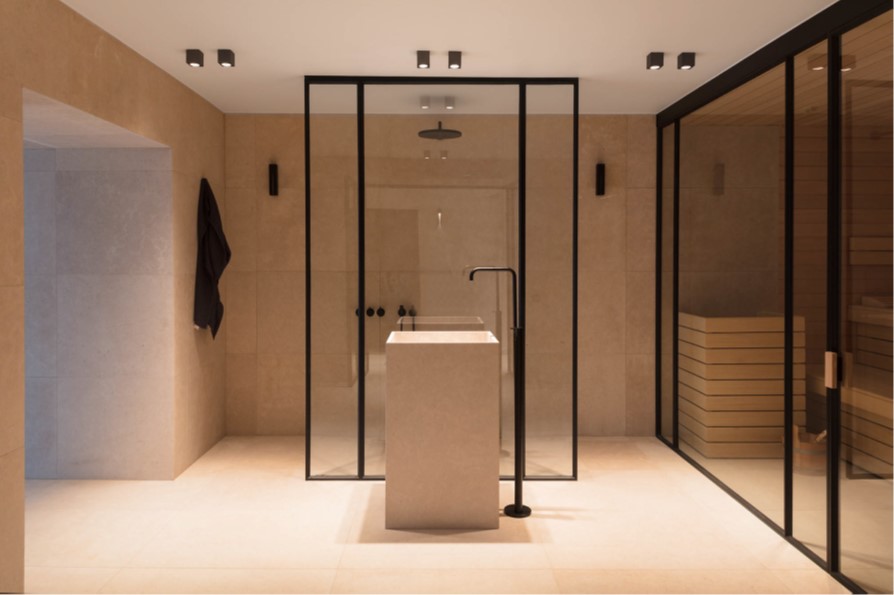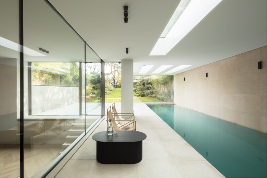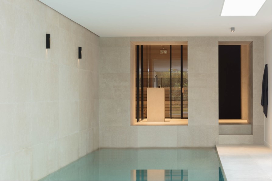 Ook op niveau -1 moest er licht naar binnen worden getrokken, want er werd een complete spa met een binnenzwembad van 15,5 m lang, een sauna, een massageruimte en een fitnessruimte voorzien. Vier grote lichtstralen, verwerkt in het boventerras, verlichten het zwembad. Door het terrein te verlagen lijkt het alsof je zo de tuin in zwemt en kan er ook gebruik gemaakt worden van grote glazen ramen. De fitness- en polyvalente ruimte krijgen ook een betere verbinding met het buitenleven.