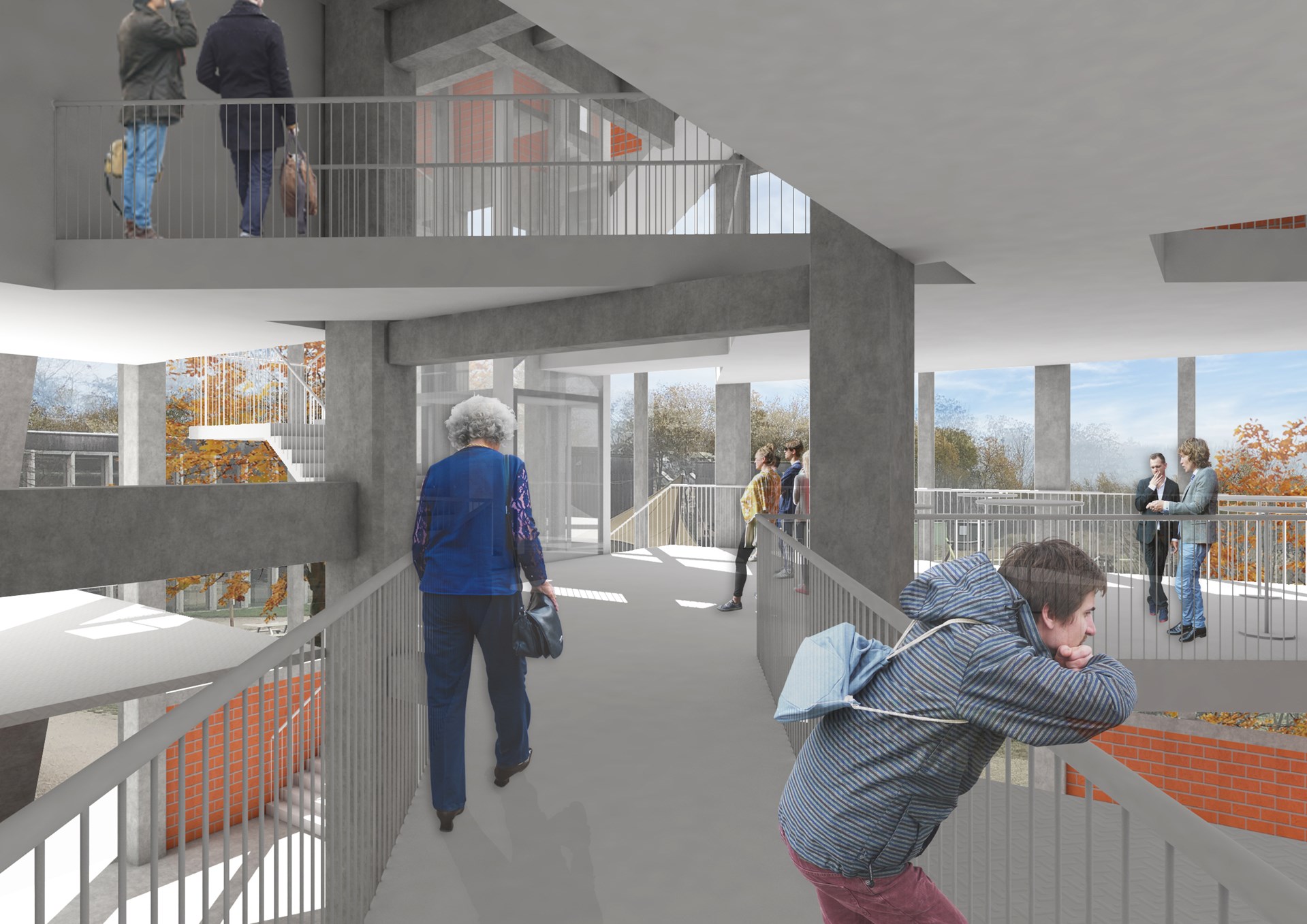 Een accent in de vorm van een 'zwevend dak' benadrukt de toegang, de effectieve ‘poort’ tot het park. Geïntegreerd in de open structuur en gericht naar het ‘arriveren’ symboliseert dit (groene) dak het binnenkomen en verduidelijkt het de toenadering en circulatie. De luifel start buiten de schacht en loopt binnen verder. In het midden is er een onderbreking. Daar krijg je vanaf het centrale punt een knap zicht omhoog.
