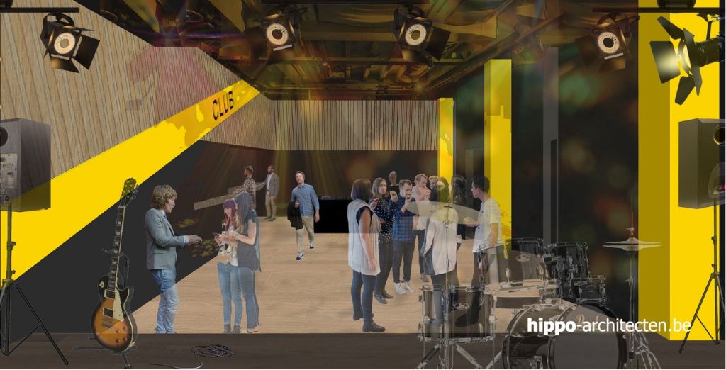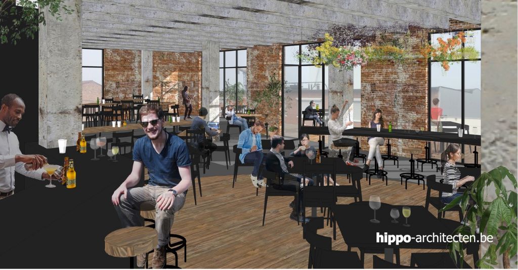 “Het is een evidente wissel geworden van ruimtes binnen hetzelfde volume”, klinkt het bij Jan Keymis van Hippo Architecten. “Het nieuwe café zal de betrokkenheid naar buiten toe vergroten door zijn nieuwe positie aan de voorheen dichtgemetselde raamopeningen in de voorgevel. De Club – waar het geluid al eens de hoogte in gaat – nestelt zich comfortabel in het hart van het gebouw. De uitstraling van het oude gebouw met zijn industriële, robuuste en ruwe look blijft behouden, al wordt er ruimte gemaakt voor iets meer verfijning in de vorm van planten en hout."