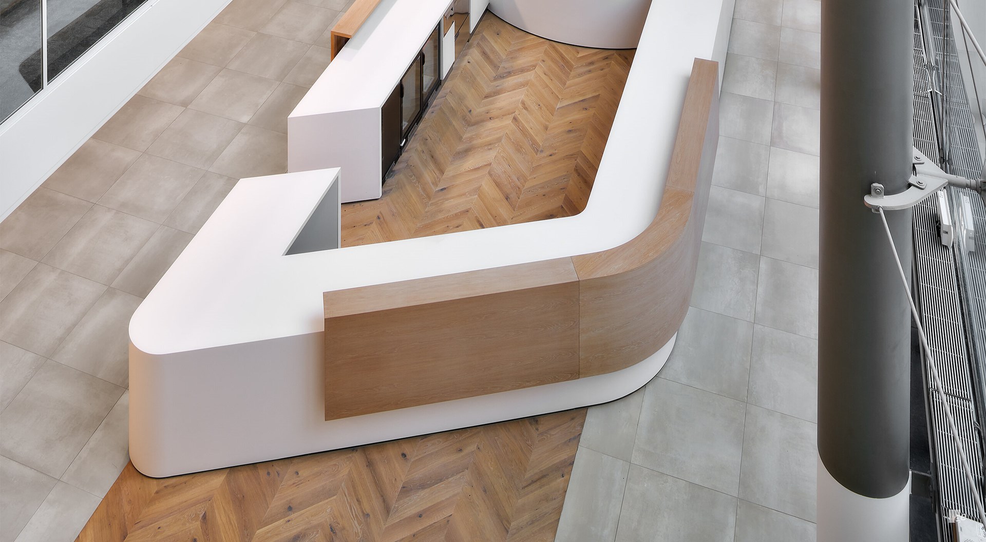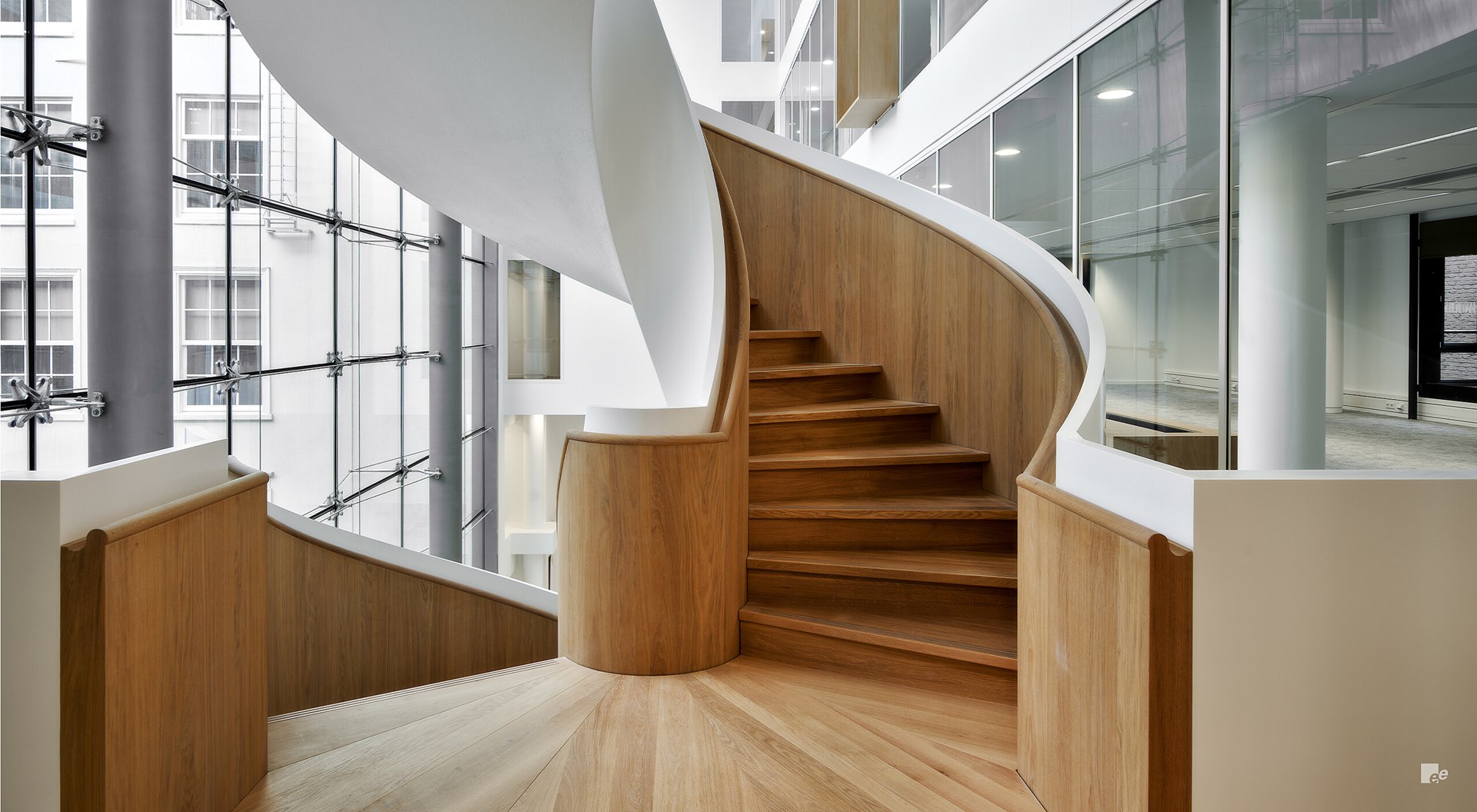 De vier verdiepingen hoge trap ziet er moeiteloos uit - een geometrisch perfecte witte spiraal met een naadloze balustrade en soffit. Maar het was een enorme fysieke uitdaging om de trap te installeren.