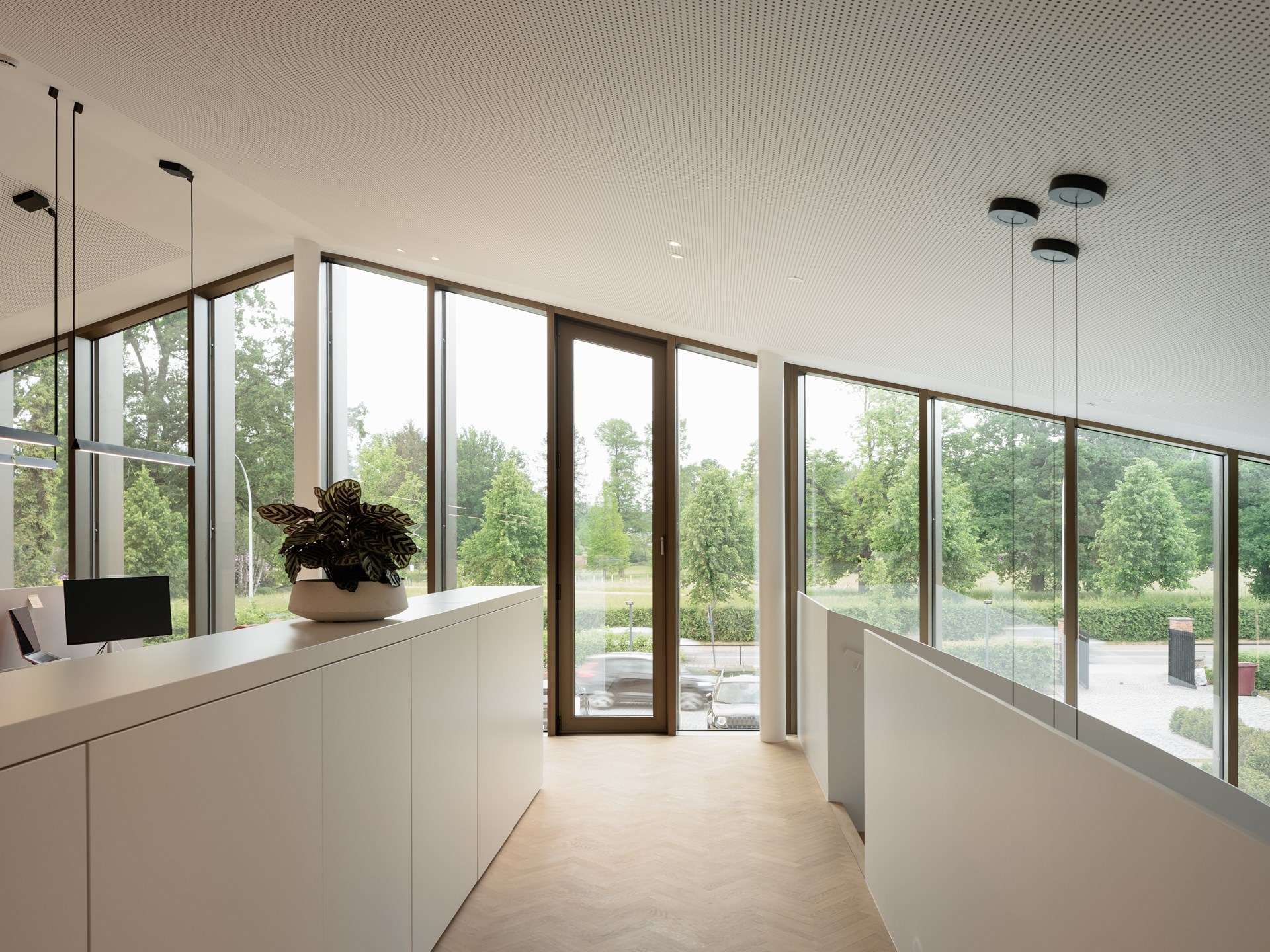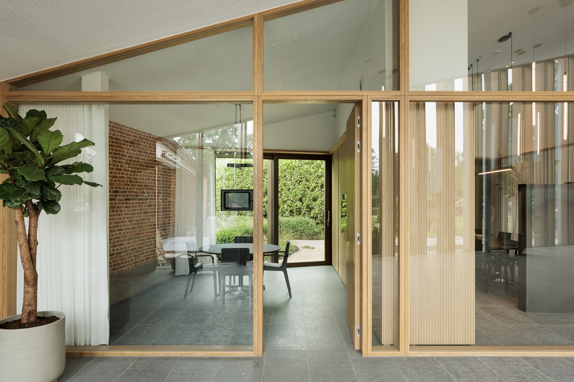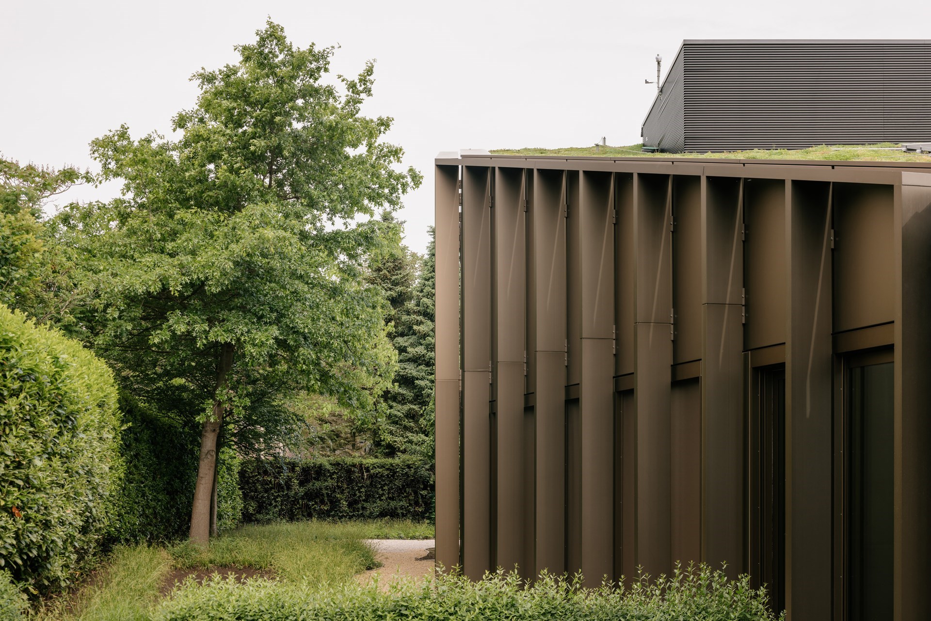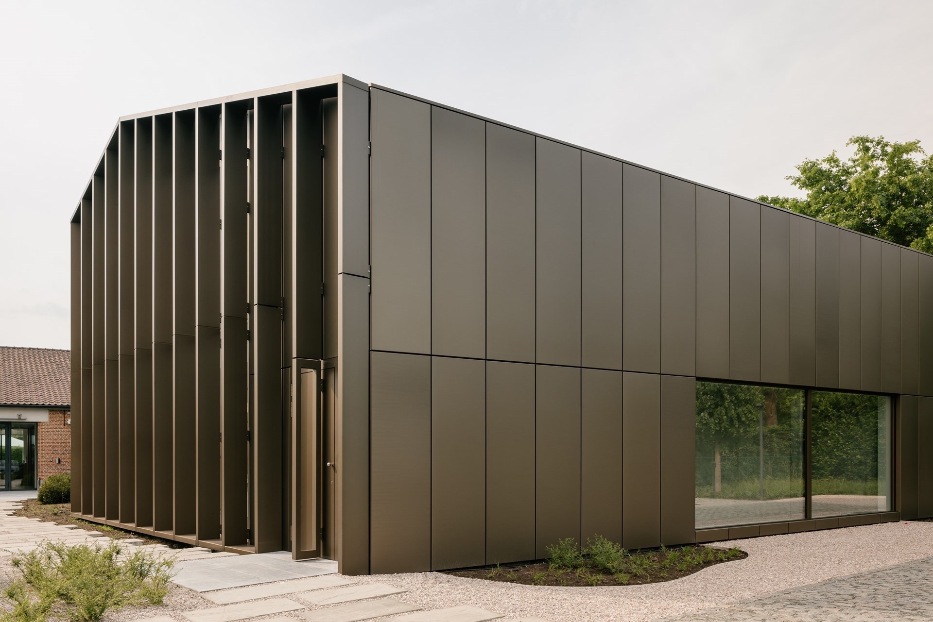 Voor de uitbreiding van het kantoorgebouw werd er met dezelfde ingrediënten gewerkt, toegepast op de hedendaagse manier. Zowel de voor- als de achtergevel zijn uitgewerkt met strakke, verticale lamellen uit geanodiseerd aluminium. Hierdoor zie je meteen de link met de gelede voorgevel van het bestaande gebouw, maar het zorgt ook voor een contrast door de strakheid en gladheid van het gekozen materiaal. De zijgevel kreeg een gesloten, vlak uitzicht door een afwerking met aluminium cassettes. Hierdoor is de link met de bestaande zijgevel meteen zichtbaar.