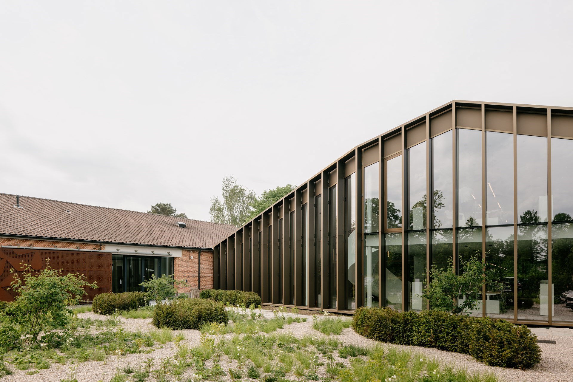 Gezien de grote historische waarde van het gebouw, zocht het ontwerpteam naar een manier om de zichtbaarheid ervan maximaal te vrijwaren. Daardoor besloot CPI samen met ABV+ Architecten om op twee niveaus te werken om de footprint van het gebouw te beperken. De keuze voor een atypisch zadeldak resulteert in een eigentijdse relatie met het bestaande gebouw. Hierdoor wordt de bovenverdieping klein in oppervlakte, wat de massiviteit van het volume beperkt. Het ontwerpteam creëerde extra ruimtelijkheid door deze verdieping op te vatten als een mezzanine.
