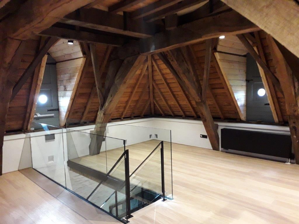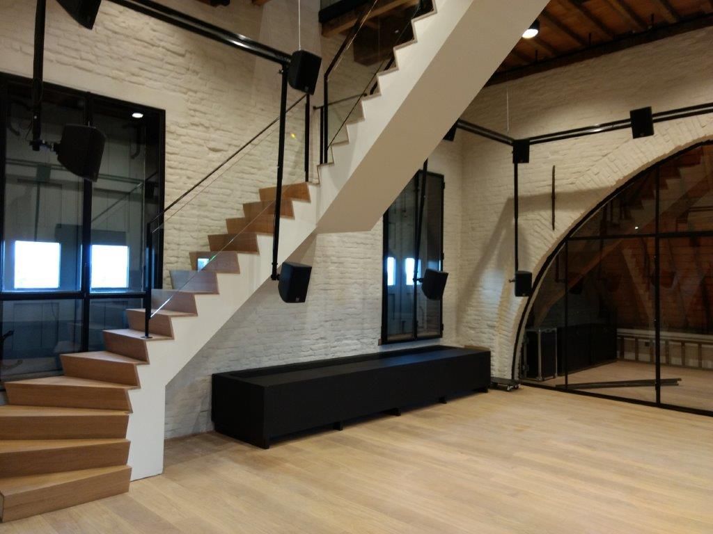 De restauratiewerken hadden dus niet alleen een esthetische, maar ook een zeer belangrijke functionele dimensie. Vandaar dat het zaak was om vaak meer dan twee vliegen in één klap te slaan. “De aanpassingen in functie van de brandveiligheid zijn bijvoorbeeld gekoppeld aan een verhoging van het comfort en de optimalisering van de lay-out. Zo hebben we de trappen in één hoek van het gebouw geconcentreerd, waardoor er een volwaardige vluchtweg ontstond en er tegelijk heel wat bijkomende ruimte vrijkwam. Dit zorgde er dan weer voor dat we het gelijkvloers met kitchenette, sanitair en technische ruimte anders hebben kunnen inrichten”, legt Tom Verbist uit. “Voorts hebben we de vloer van het tussenniveau verlaagd en de zolder ingericht om extra werkplekken te kunnen creëren. Voor het overige zijn de ruimtes en hun uitstraling grotendeels intact gebleven. De aanwezige eiken balken, wit gekaleide muren en grenenhouten plafonds zijn gecombineerd met tijdloze materialen zoals eiken vloerplanken en trappen, zwartgelakt stalen schrijnwerk, witgelakte houten rekken … Een zeer boeiende oefening! Wat het project evenzeer uniek maakt, is dat alle beslissingen in nauw overleg met de uiteindelijke gebruikers (lees: Alamire Foundation) genomen zijn. We hebben het vernieuwde poortgebouw benaderd als één integraal geheel (inclusief de interieurvormgeving), waardoor alles tot in de kleinste details klopt. Het is helemaal geworden wat we voor ogen hadden!”