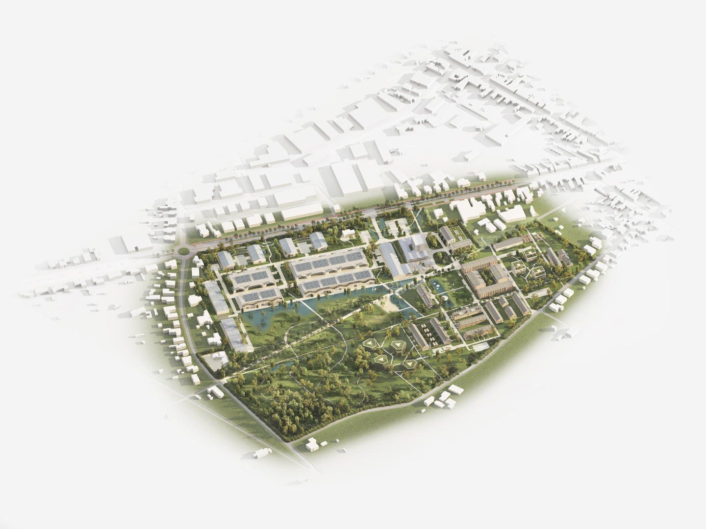 Met een oppervlakte van 20,5 hectare vormt de site een van de grootste stadsontwikkelingen in de regio. De ligging – aan de rand van het dorp, grenzend aan het Ryckeveldebos – biedt tegelijk aansluiting op de dorpskern en een directe relatie met het landschap. Die dubbele kwaliteit wordt uitgespeeld in het ontwerp, dat inzet op een verweving van functies, publieke ruimte en natuur. De herontwikkeling is opgevat als een langetermijntraject: tot 2037 wordt de wijk stapsgewijs gerealiseerd. De voorbereidende infrastructuurwerken starten in 2027, en vanaf 2029 worden de eerste woningen, herbestemde gebouwen en publieke voorzieningen opgeleverd.