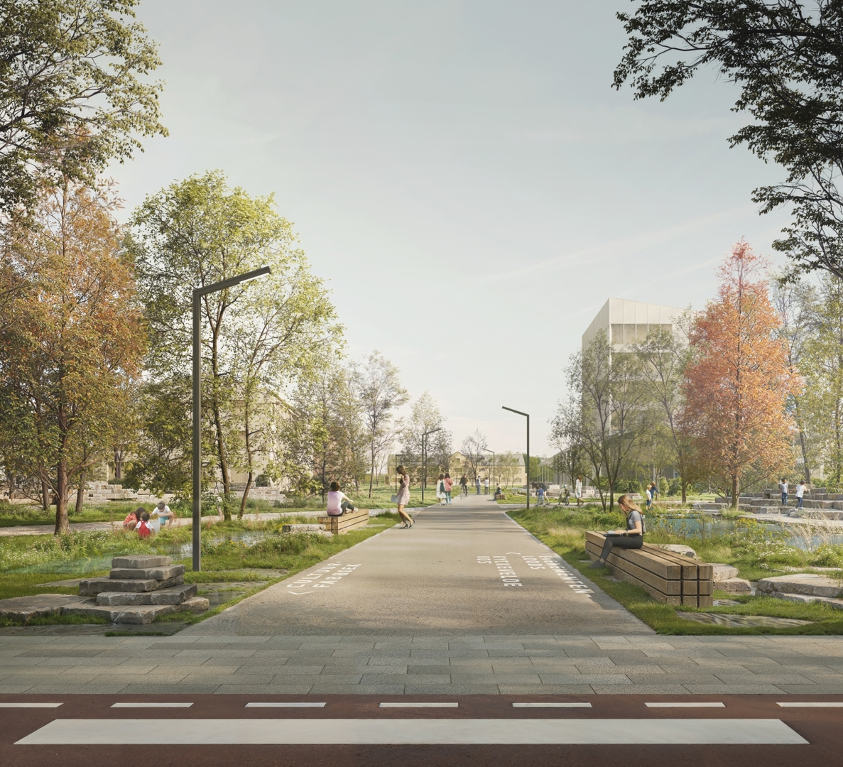 Het ontwerpteam vertrok vanuit de aanwezige structuur van de kazerne: de orthogonale inplanting, de langgerekte zichtassen, de open ruimtes en het ensemblekarakter van de bestaande gebouwen. Deze erfgoedwaarden worden niet enkel behouden, maar ook geactiveerd. Zo blijft de centrale dreef behouden als ruggengraat van het plan – een groene as die de wijk verbindt met het dorpscentrum en het achterliggende bos. De gebouwen en infrastructuur vertellen het verhaal van een andere tijd, maar lenen zich tot adaptief hergebruik.
