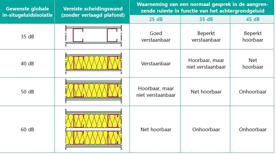 De globale in-situgeluidsisolatie tussen twee kantoren wordt zowel bepaald door de geluidsisolatieprestatie van de scheidingswand als door deze van het verlaagdeplafondsysteem en zijn aansluitingswijze (zie TV 232). Om te komen tot de gewenste geluidsisolatie (zie tabel A), moet men kiezen voor een geschikte scheidingswand en een geschikt plafondsysteem. Het zwakste element bepaalt immers de globale geluidsisolatie.