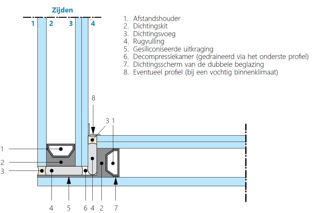 Dit artikel spitst zich louter toe op de uitvoering van beglazingen die onder- en bovenaan in een schrijnwerkprofiel geplaatst worden en met een verticale dichtingsvoeg op basis van kit met elkaar verbonden worden.