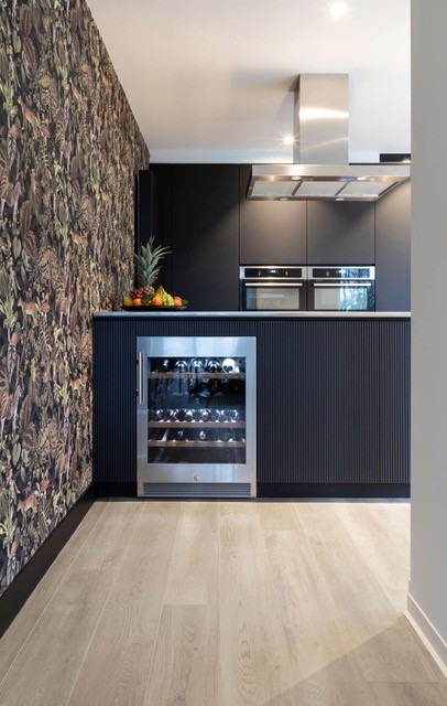“Lorenz en Elyne droomden van een interieur met een hoek af. Dat zie je in de materiaalkeuze, zoals het behang in de keuken. Daarom koos ik voor elke ruimte voor Baltimore Oak 95, een vloer met een originele parketlook. De vloer creëert rust en balans in het drukke interieur. In de eetkamer/ living accentueren de lange planken de lengte van de ruimte. Dat doet ze optisch groter lijken. De planken liggen door de hele woning in dezelfde richting. Daardoor zijn er geen storende overgangen tussen de ruimtes. Dat creëert in deze bungalowwoning een heel open effect.”