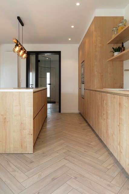 “Die van Nele en Dries in Affligem. Dit jonge koppel wenste een warm, gezellig en sfeervol interieur, maar tegelijkertijd ook iets modern en fris. Ik wist dat ze heel graag een visgraatvloer wilden, en ze hadden geluk: COREtec® heeft een prachtige lichte visgraatvloer in het assortiment. De keuken is vrij ruim, waardoor het drukkere motief van de vloer perfect tot zijn recht komt. De kleur sluit mooi aan op het hout van de keuken, wat het tot één geheel maakt.”