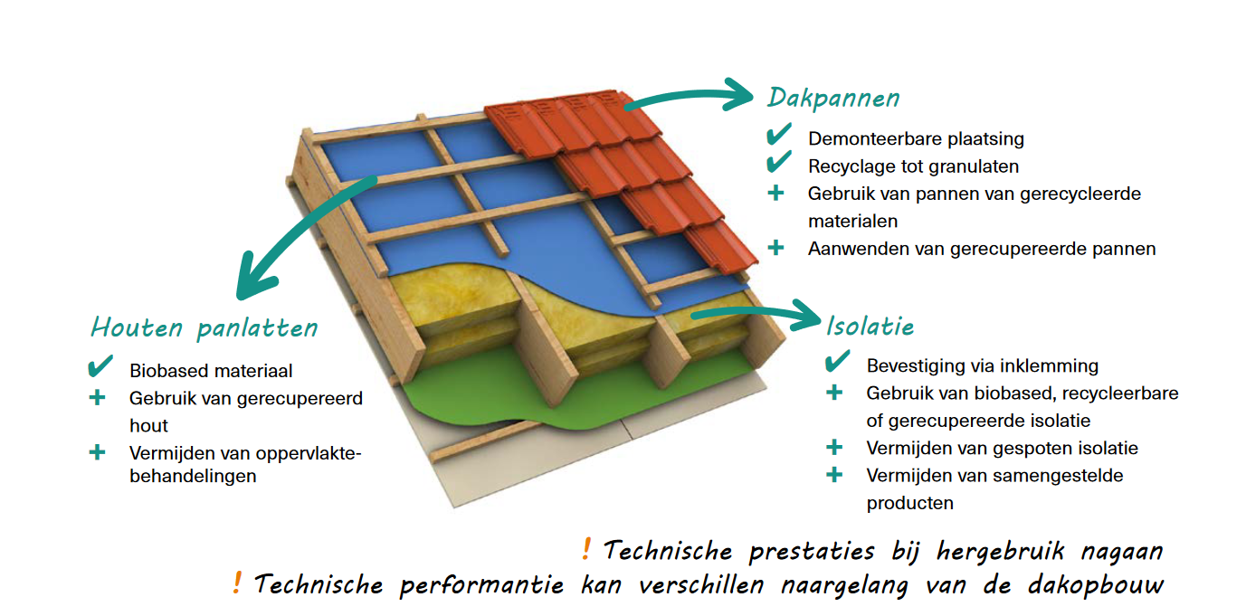 De huidige opbouw van hellende daken beantwoordt al aan heel wat circulaire vereisten. Zo kunnen pannen gedemonteerd worden, waardoor lokale vervangingen mogelijk zijn en de pannen gerecupereerd kunnen worden. Het hout waaruit de draagstructuur meestal opgebouwd is, kan eveneens hergebruikt of gevaloriseerd worden. De mechanische bevestiging of inklemming van isolatieplaten laat dan weer toe om de platen te recupereren voor hergebruik of recyclage.