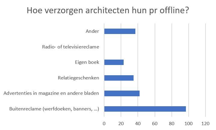 Buitenreclame in de vorm van werfdoeken en banners vormt de belangrijkste vorm van offline reclame voor architecten. 57% maakt daar gebruik van. Dat is niet te verwonderen, maar anderzijds is het toch eigenaardig dat meer dan 40% geen gebruikmaakt van deze vorm van reclame die nagenoeg gratis is en toch veel visibiliteit oplevert. Het is een fenomeen dat je ook kan zien wanneer je langs Vlaamse bouwwerven loopt: de aannemers en onderaannemers laten aan de hand van werfborden duidelijk zien dat zij actief zijn op de werf, maar van de architect of het studiebureau tref je vaak geen werfbord aan.