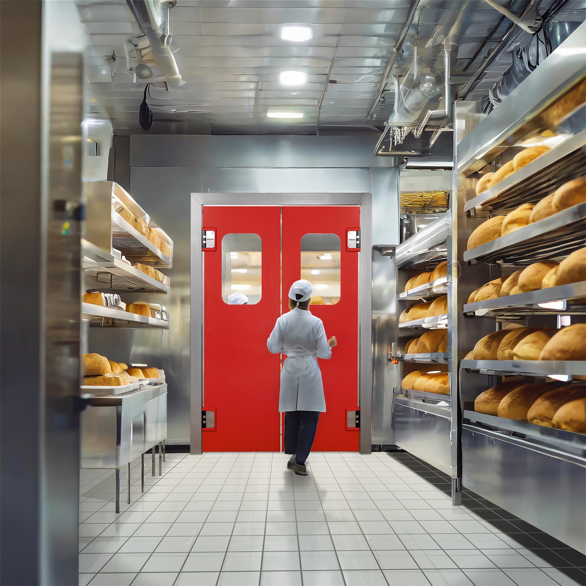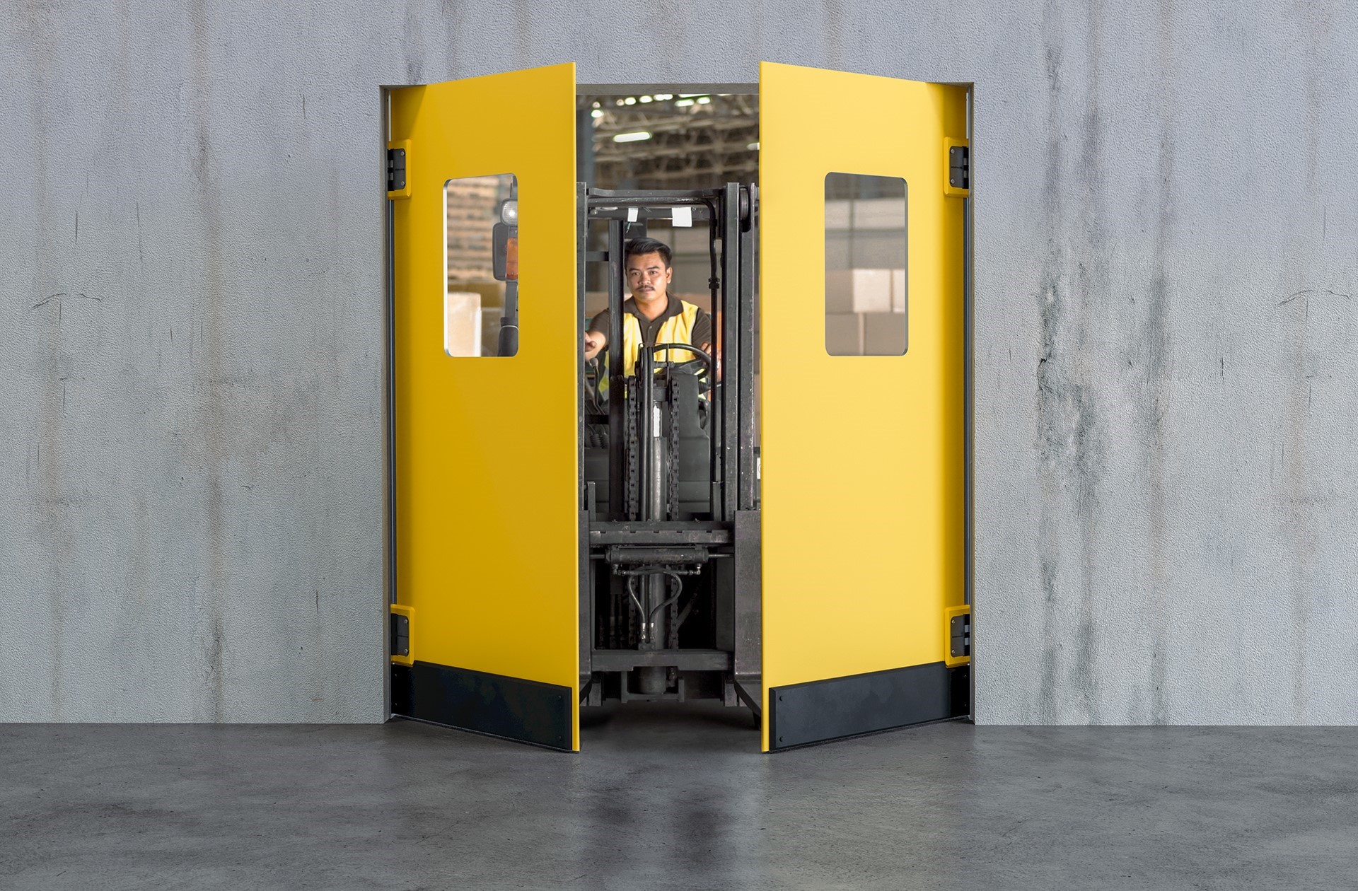 Het nieuwe pendeldeurengamma van Hörmann combineert een robuust ontwerp met soepele werking. De deuren zijn verkrijgbaar in polyethyleen (PE) of roestvrijstaal in tien standaardkleuren en kunnen temperaturen tot –30°C weerstaan. Ze zijn onderhoudsvrij, stroomloos en eenvoudig te monteren. De speciale, stootvaste en onderhoudsvrije roestvrijstalen scharnieren zorgen voor duurzaamheid. De deurvleugels kunnen via het scharniersysteem met een openingshoek van 180° of 360° geopend worden.