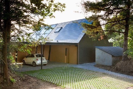 Onopvallend opvallend, zo zou je de vernieuwde hoeve in Schaffen bij Diest kunnen noemen. Dat is te danken aan BXL-architecten, maar ook aan de zwarte fotovoltaïsche leien, waarmee de gevel bekleed is.