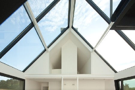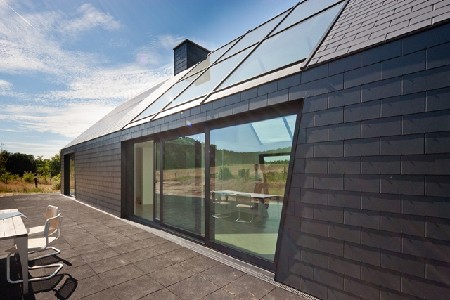 De hoeve staat op een zwevend dek. Aan de zuidkant bevindt zich een terras dat door een met vezelcementplaten beklede carport van de straatkant afgeschermd wordt. De gevels zijn bekleed met zwarte Borondaleien van het bedrijf Eternit. De leien zijn fotovoltaïsch en door de sterke afwerkingslaag kunnen water en vuil gemakkelijk afglijden. Volgens de architect transformeren de donkere leien de hoeve tot ‘een schaduw van zichzelf’. Dat lijkt een bescheiden doelstelling voor een architect, maar het was wegens stedenbouwkundige redenen noodzakelijk dat de hoeve beter bij het landschap paste. Je kan namelijk niet zomaar in zo'n mooie omgeving wonen. Maar opdat de bewoners beter van dat landschap kunnen genieten, heeft men de woning aan de binnenkant onder 9 graden gedraaid.