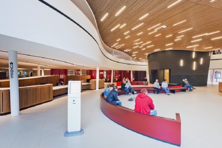 Wanneer je van het centrum van Houthalen naar de oude mijnsite wandelt, kan je het NAC niet missen: dit warmrode gebouw met zijn glanzende felblauwe toren en zijn groendaken die bijna tot tegen de grond glooien, nodigt uit om dichterbij te komen en ook de binnenkant te verkennen. Daar vind je dezelfde glooiende vormen en dezelfde open, uitnodigende sfeer die het gebouw zowel voor bezoekers als voor de werknemers tot een aangename plek maken.