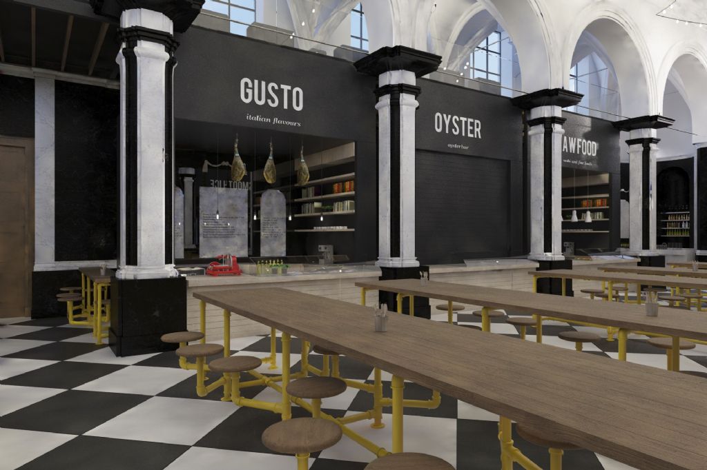 Holy Food Market is geïnspireerd op voedselmarkthallen zoals je die vindt in Barcelona, Rotterdam en Kopenhagen: een soort overdekte marktplaats waar je bij verschillende eetkraampjes allerlei lekkernijen kan proeven. In de zijbeuken komen er 12 eetkraampjes, centraal in de ruimte een middenplein met een zitgedeelte met lange tafels.