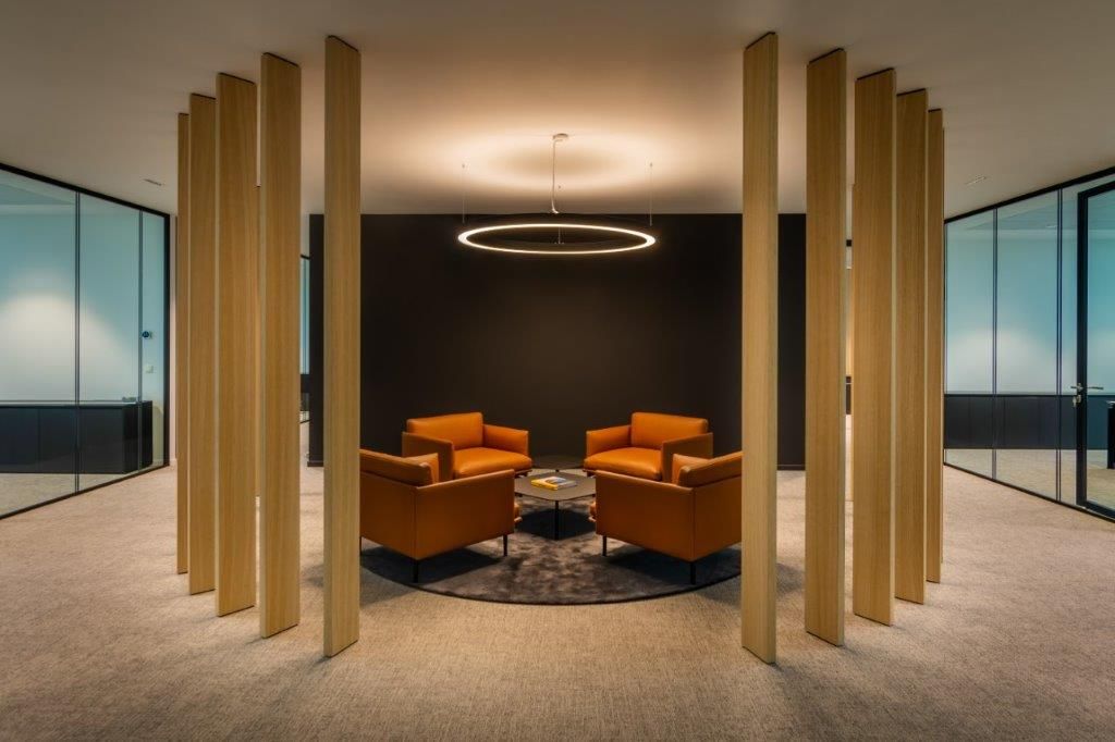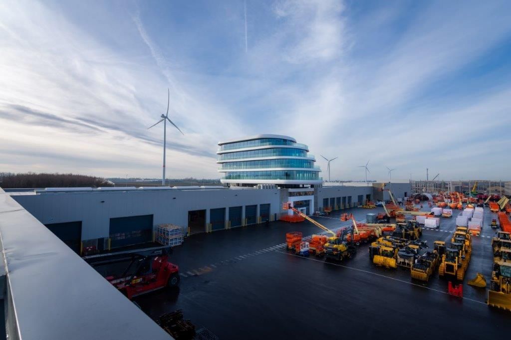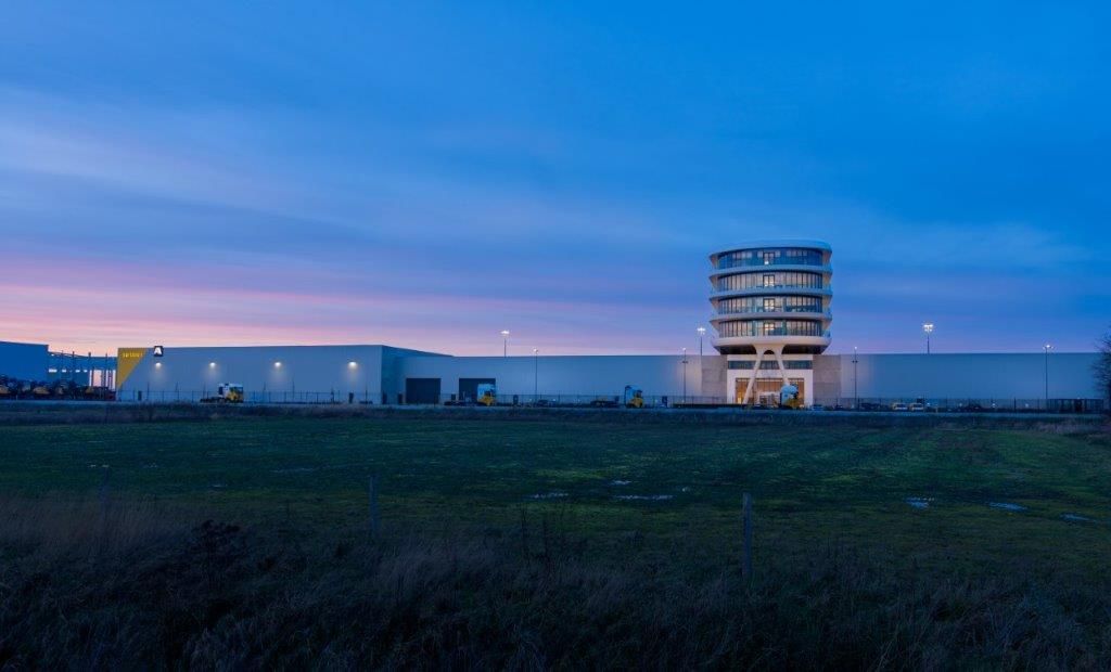 Het langgerekte magazijncomplex laat zich omschrijven als een klassieke, functionele industriebouw, waar beton en sandwichpanelen de boventoon voeren. Het is dan ook vooral het kantoorvolume dat de show steelt. Met zijn elegante vormgeving en zwevende effect tilt het de architecturale kwaliteit van het gebouw letterlijk en figuurlijk naar een hoger niveau. Het kantoorvolume is boven op het magazijnniveau geplaatst en bereikt zo een hoogte van bijna 30 meter. Het hoeft dan ook niet te verwonderen dat het dé blikvanger van de site is, zeker wanneer de duisternis is ingevallen en de buitenverlichting voor extra exposure zorgt. Dankzij de ronde vormen, de witte Corian-gevelbekleding, de grote glaspartijen en de uitkragende terrassen is het een alzijdig geheel dat zich zonder verpinken profileert als de architecturale kers op de taart.