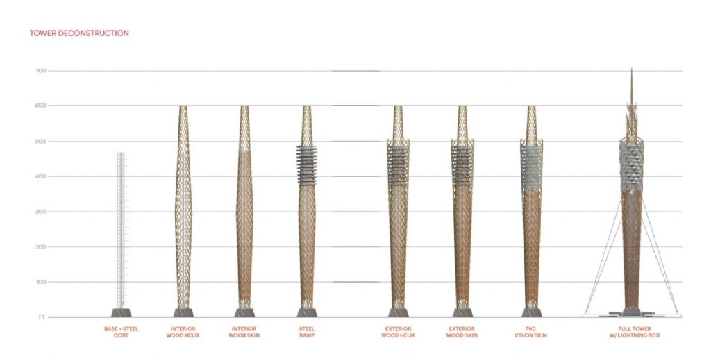 De toren wordt gemaakt van twee helixrasters die bestaan uit prefab gebogen gelamineerdhouten balken die ter plekke binnen zes maanden gemonteerd kunnen worden. Het eerste deel van de toren tot 145 meter bevat een stalen kern met het filtratiesysteem en wordt verankerd met trekstangen in een betonnen fundering. Tussen de 115 en 145 meter wentelen de bezoekers via een stalen spiraal naar boven. Daarboven bestaat de constructie enkel uit hout. Het rasterpatroon is gebaseerd op het mandvlechtwerk van de Lenape-indianen die vroeger tijden in Manhattan leefden.