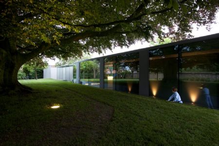 Uitgaande van de bestaande omrandende muurconfiguratie koos men voor een transparant lineair volume dat zich diende in te schuiven onder de bestaande beuk. Hiertoe werd een verlaging van het bestaande peil van circa 50cm aangehouden. De nieuw ingebrachte muren spelen in op de bestaande omrandende tuinmuurconfiguratie en bakenen specifieke zones af. De rest is een transparante invulling met glas.