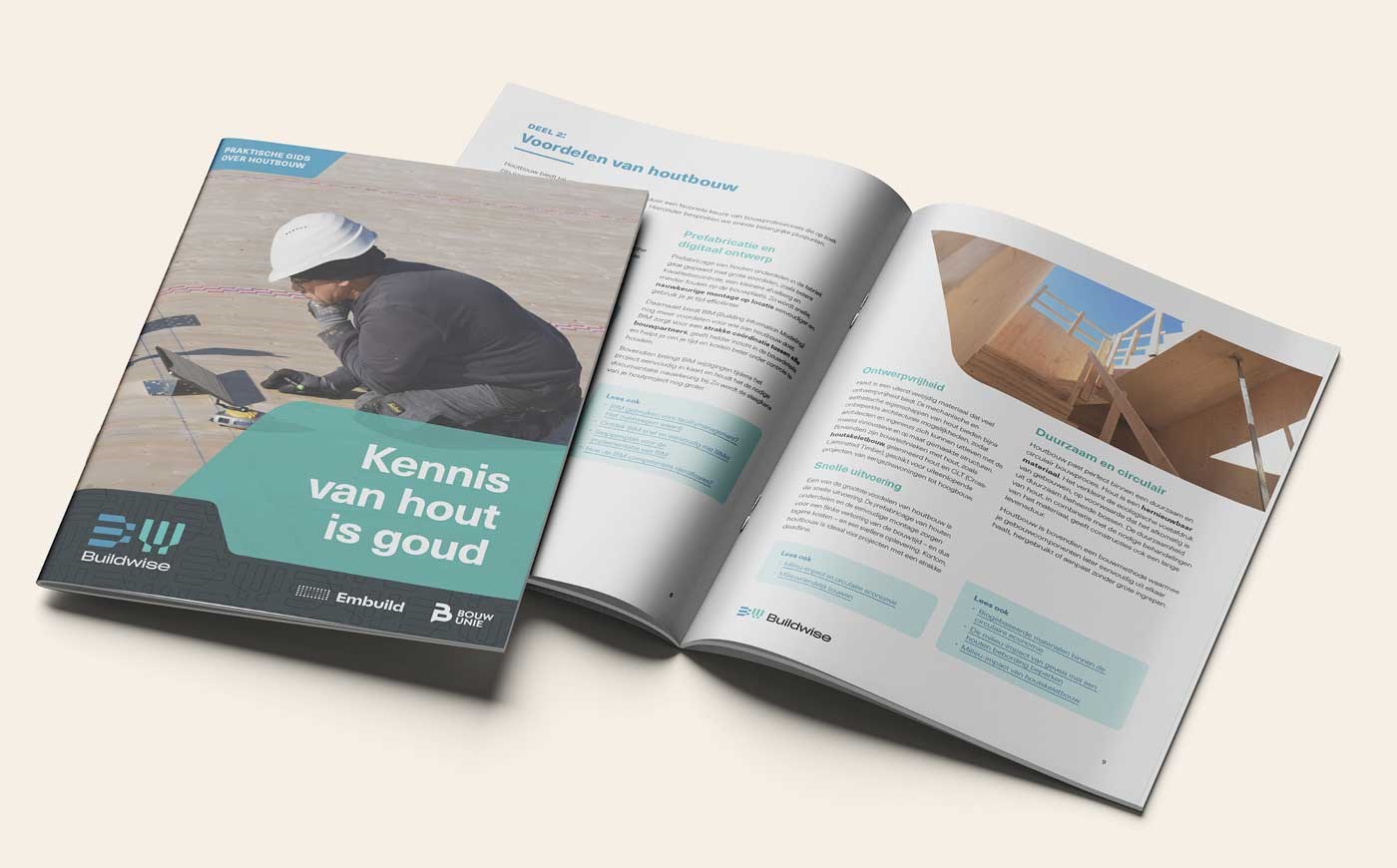 De houtbouw is een toonbeeld van duurzaamheid en innovatie, en is duidelijk in opmars. Maar bouwen op basis van hout verschilt best veel van het meer traditionele bouwen op basis van beton. Dat betekent ook dat het ontwerpen en implementeren van deze bouwmethode een andere aanpak vergt. Daarom lanceert Buildwise samen met Embuild en Bouwunie de campagne ‘Hout is goud!’. Deze campagne is gericht op aannemers, architecten, studiebureaus, leerkrachten, docenten en studenten. De klemtoon ligt op houtbouw, prefabricatie en biogebaseerde materialen. Buildwise ontwikkelde een overzichtelijk e-book voor bouwprofessionals en studenten dat alle relevante (technische) aspecten onder de loep neemt.