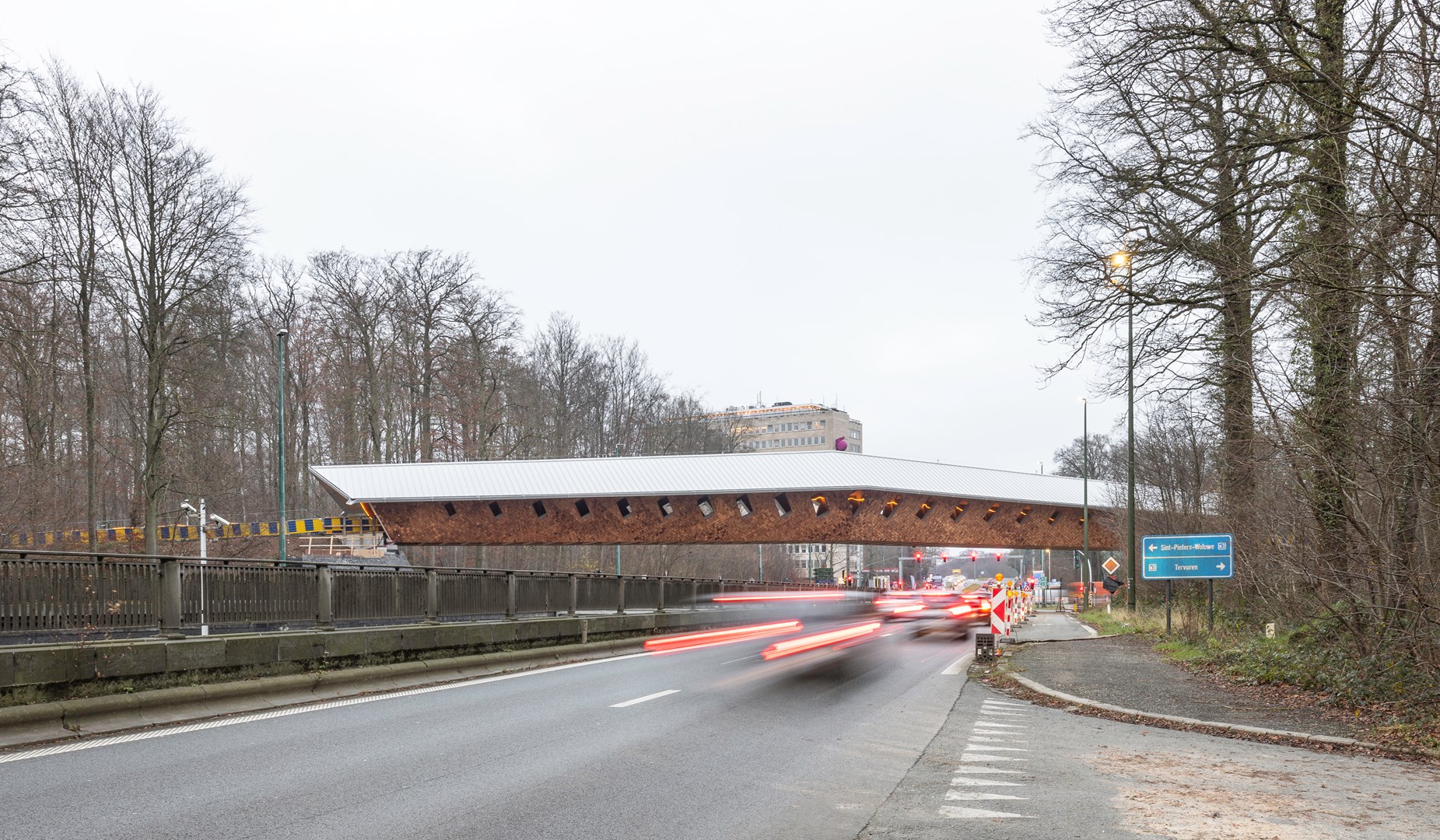 Houten fiets- en voetgangersbrug van Ney & Partners boven Vierarmenkruispunt geopend