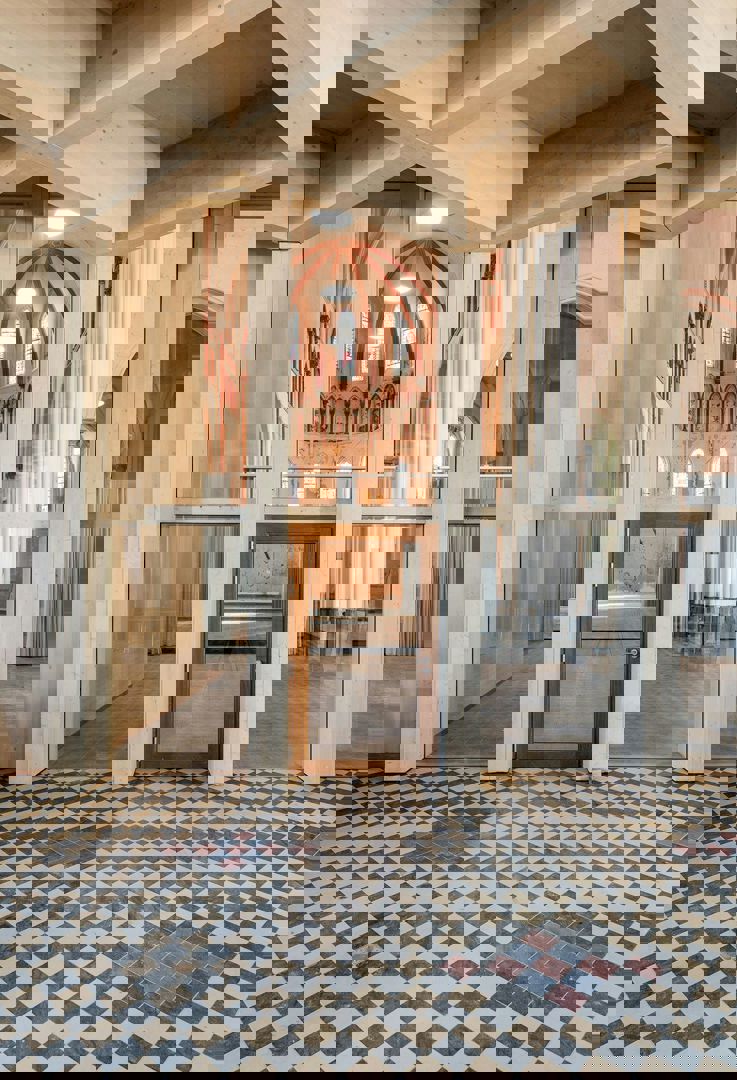 Dankzij de houtinbouw in de bestaande structuur waren er geen ingrijpende werken nodig voor de herbestemming, waardoor de ziel van de kerk behouden bleef.