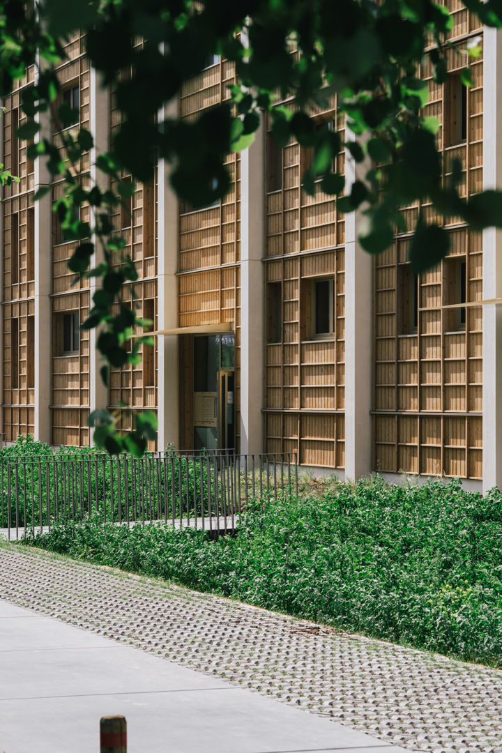 BAN maakt indruk met zijn opvallende houten gevelraster, een van de architecturale signaturen van Shigeru Ban. De combinatie van hout, beton en staal resulteert in een hybride structuur die tegelijk robuust en verfijnd oogt. De houten elementen geven het gebouw niet alleen warmte en identiteit, maar dragen ook bij aan een duurzamer bouwproces. Het gebruik van voorbewerkte, slijtvaste Europese houtsoorten helpt de ecologische voetafdruk van het project te beperken, zowel in de productie als in de levensduur van de materialen.