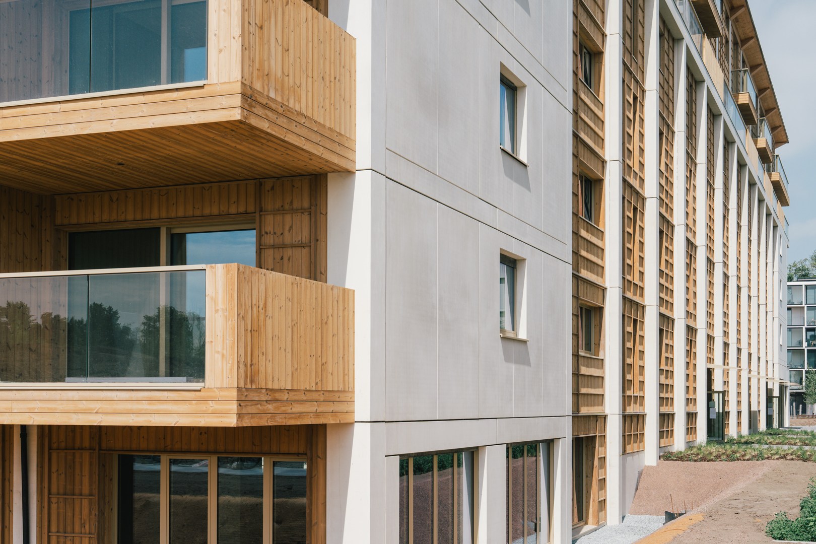 BAN is Shigeru Bans eerste residentiële project in België en vormt een nieuwe landmark aan de zuidrand van de stad. Het geheel bestaat uit een elegante toren van 25 verdiepingen en een lager bouwvolume van zes lagen. Samen omarmen ze een centrale binnentuin van 6.000 m², ontworpen door landschapsarchitect Bureau Bas Smets. De technische uitwerking van het ontwerp gebeurde in samenwerking met Bureau Bouwtechniek, dat meewerkte aan de integratie van de hybride structuur en de detaillering van de houten gevel. Voor die gevel werd gekozen voor LDCwood® ThermoWood® grenen, geleverd en brandvertragend behandeld door Lemahieu Fire Protection. Het resultaat is een verfijnde en performante gevelbekleding die de warme uitstraling van het gebouw mee vormgeeft.