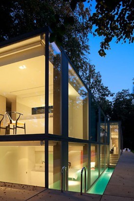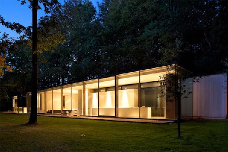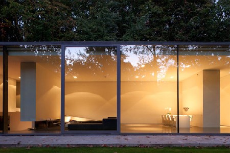 De stalen draagconstructie met een raster van 5,40 meter integreert kolommen in de glaswand. Bij de doorgedreven gemoduleerde behandeling ligt de nadruk op de expressieve kwaliteiten van de logisch opgezette en consequent uitgevoerde bouwtechniek. Elke vormgeving vloeit voort uit de constructie en groeit nadien naar het programma toe. Vergelijkbaar met de wijze waarop de enorme, opendraaiende glasvlakken inspelen op de overgang tussen woning en tuin, treedt de 53 meter lange afrormosia houten wand met de verdiepingshoge, dubbele deur op als een intercedent tussen de koele staalconstructie en het weidse bos.